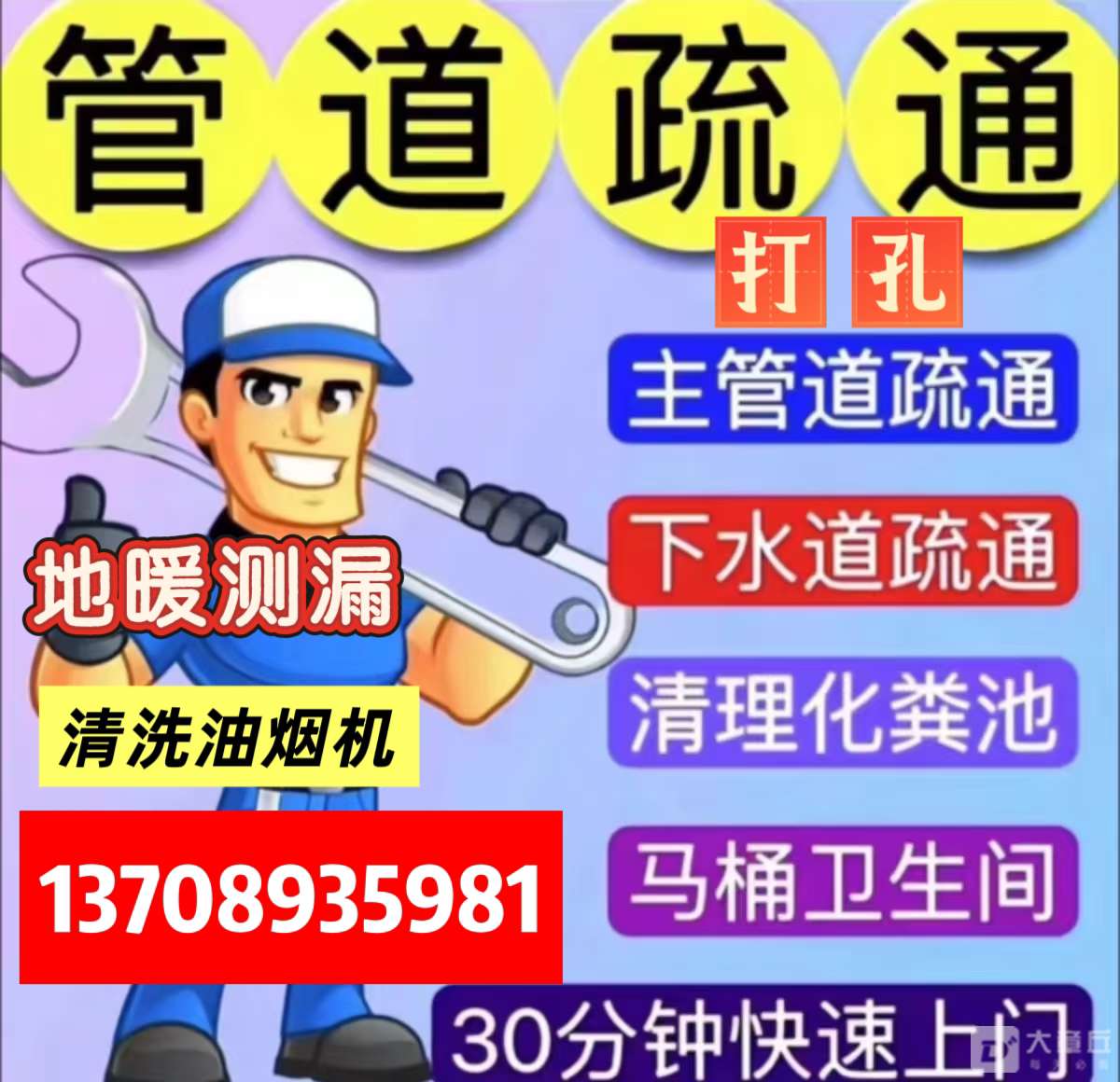 专业疏通下水道,测漏,高空作业,打孔。