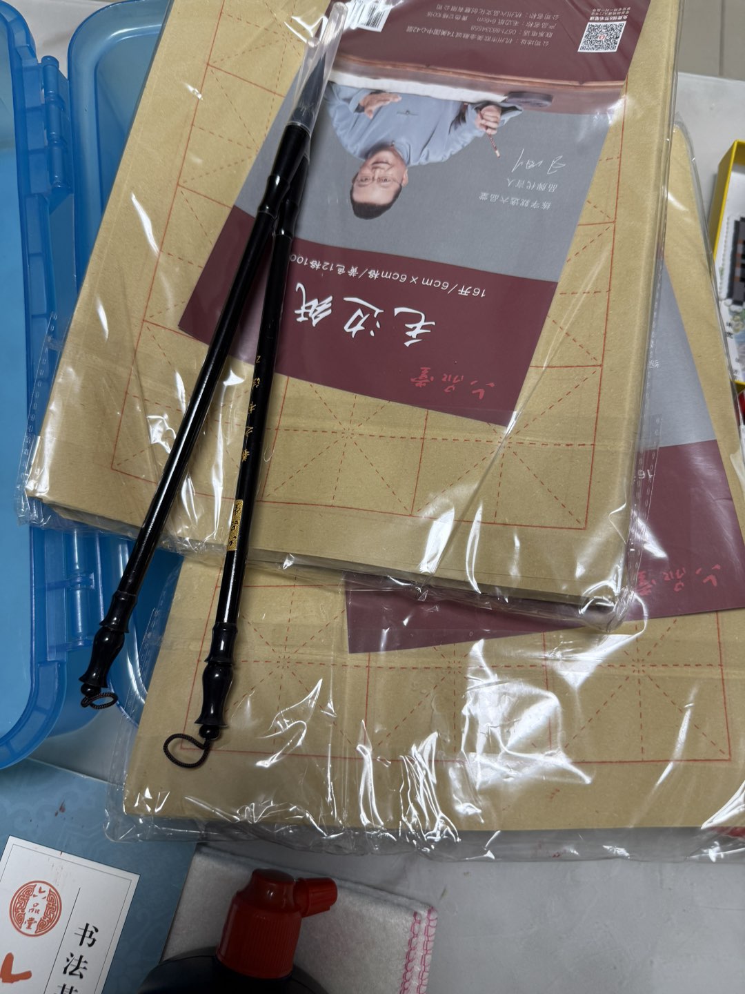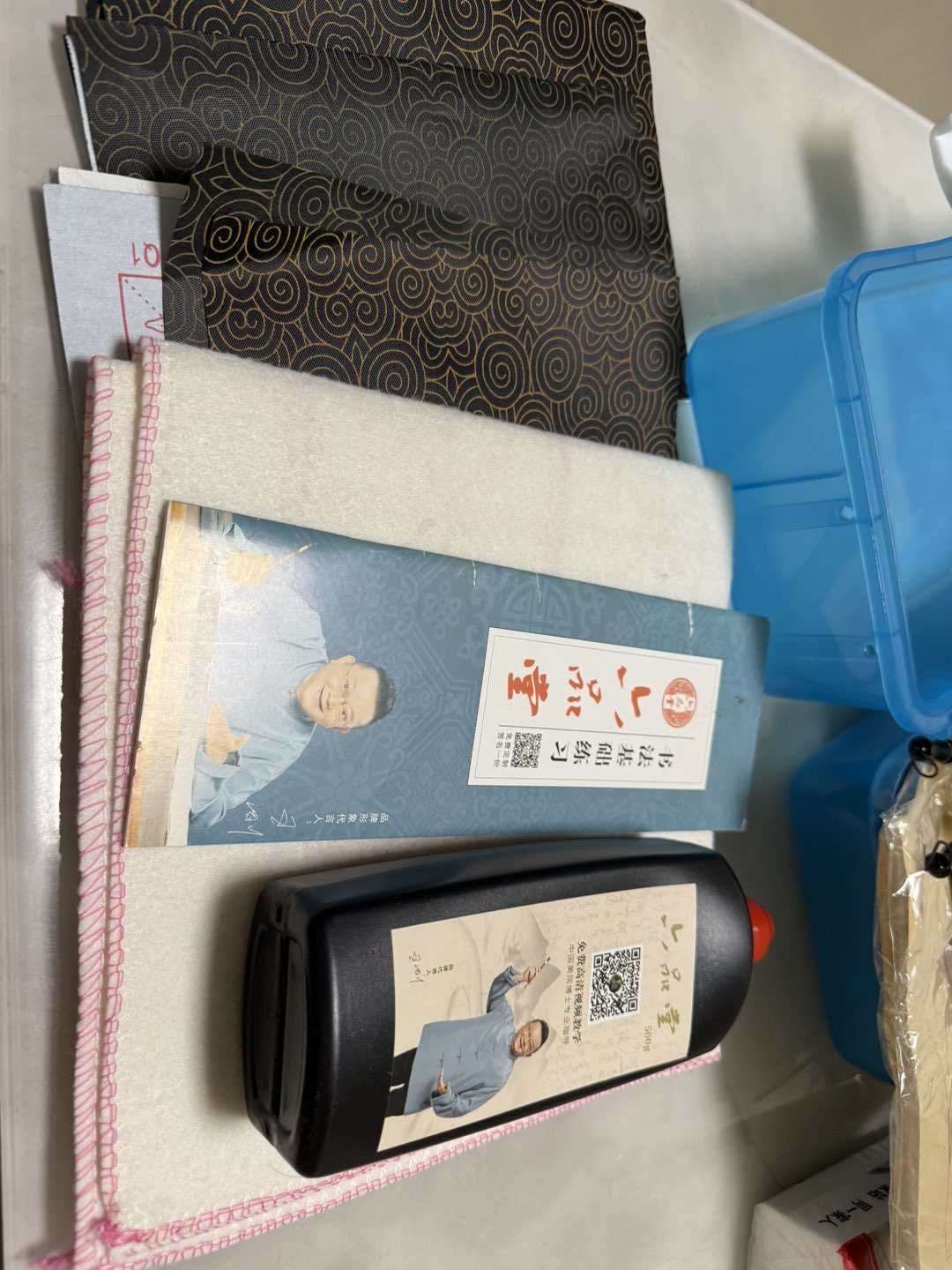 书法部分用品一批,毛毡1个,水写布4张,毛边纸200张,墨水60克,笔2支,手提箱1个。