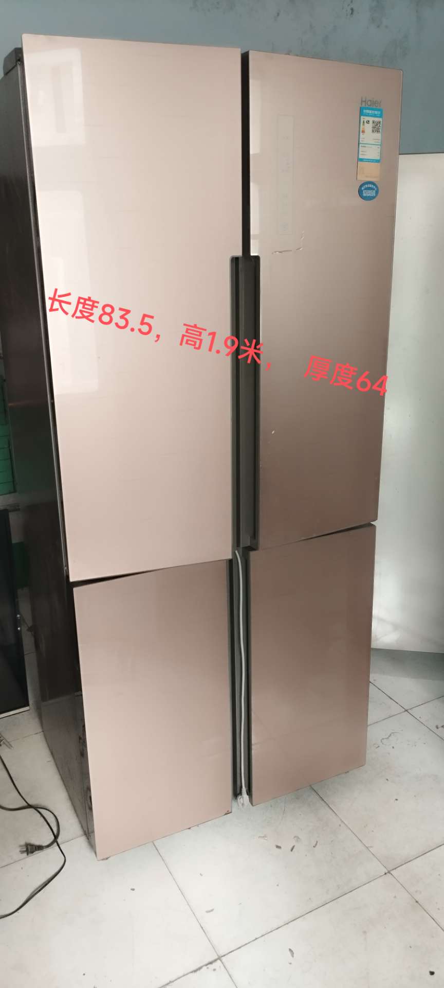海尔大四门,是全风冷无霜冰箱,一级能效,制冷正常,内外干干净净的,全款价格为700元,高度1.9米,可以废旧家电置换,可以送货,可以帮忙装车,需要的联系