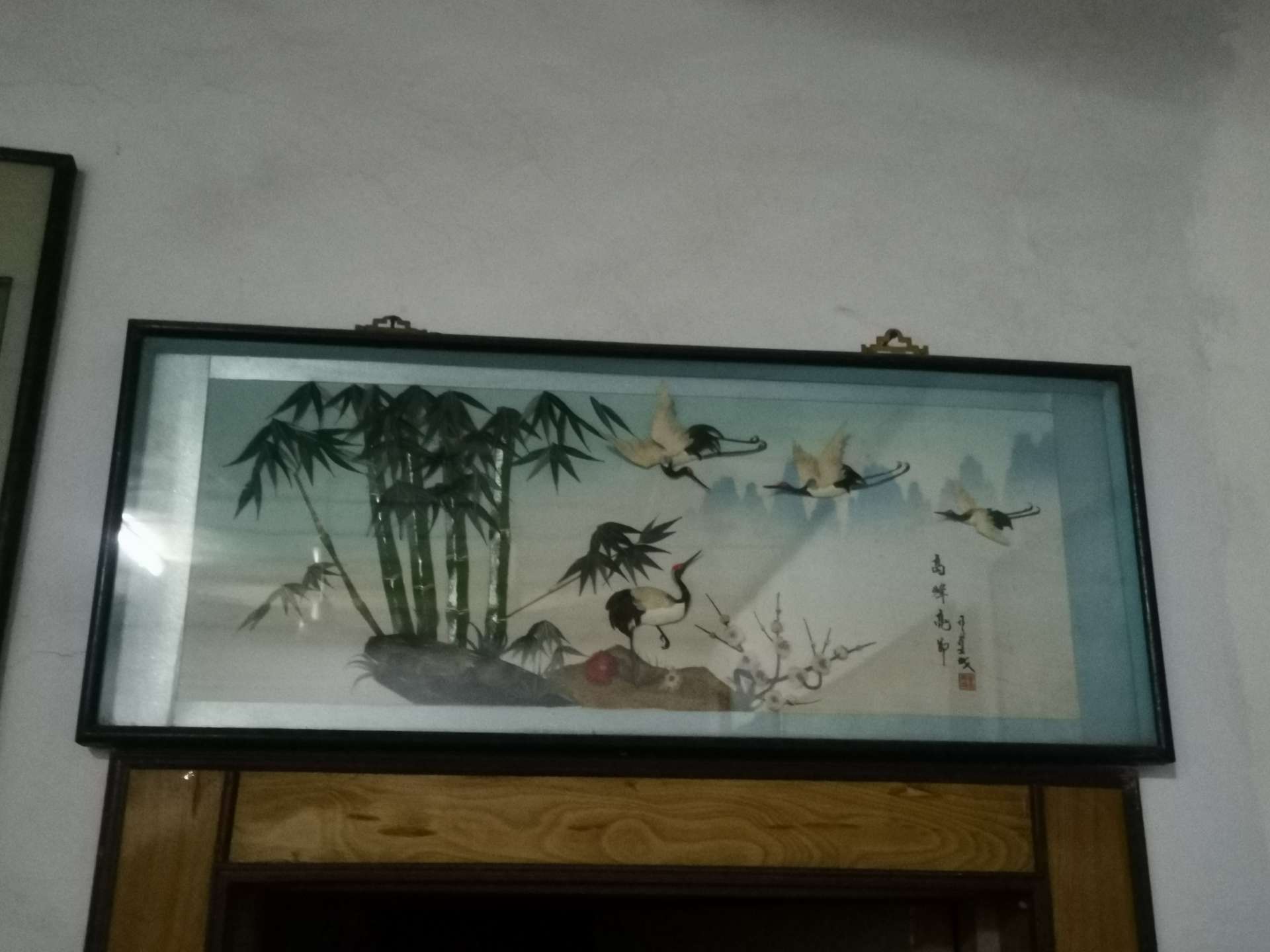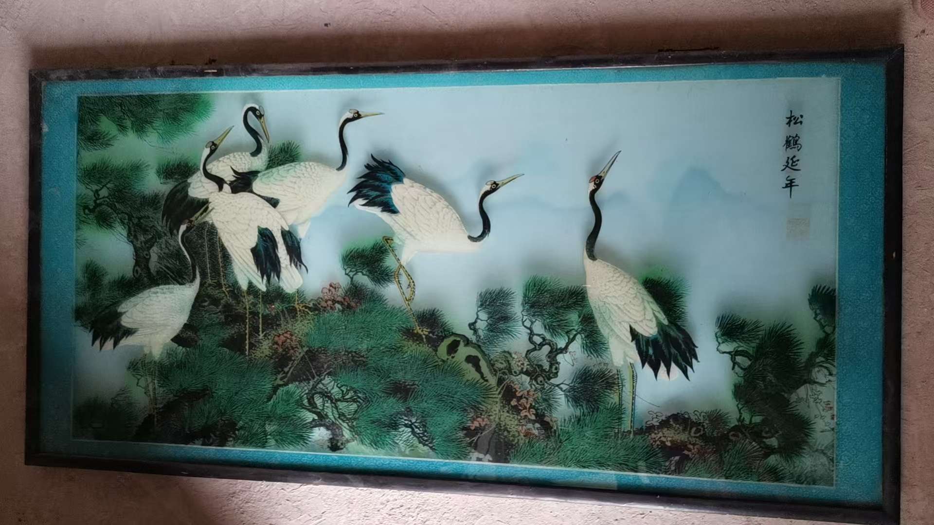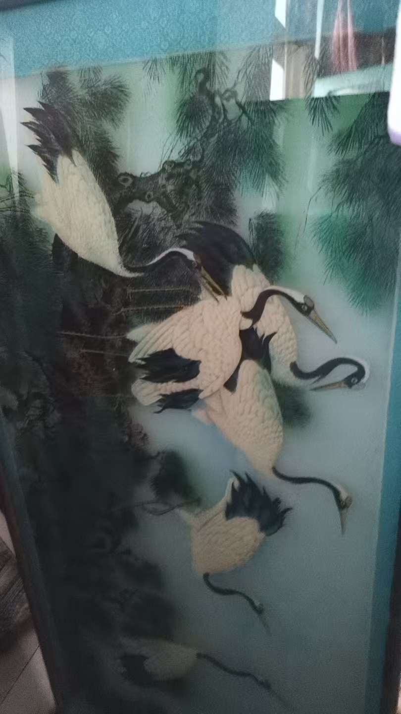 老玻璃画两幅,松鹤延年122*60、竹报平安116*46,手绘工艺,画面精美,寓意好。带原装木框,尺寸大,具体看图。成色还可以,有岁月痕迹,整体挺新。章丘自提。