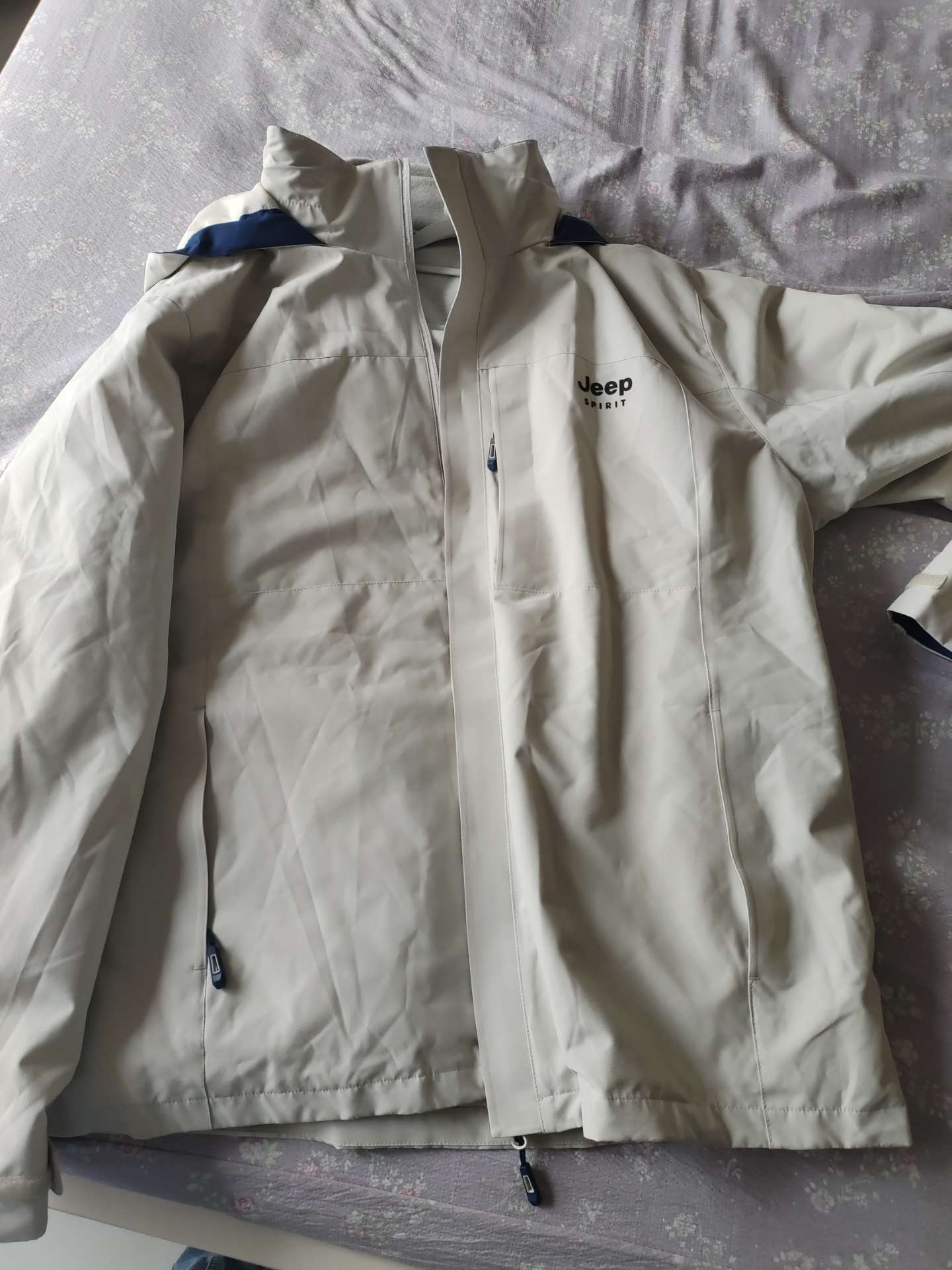 全新Jeep SPIRIT冲锋衣,米白色,2XL码,三合一设计,带吊牌,正品,质量真的不错,面料舒服,内胆可拆,春秋冬都能穿,男女都能穿,宽松不挑人,具体尺寸看图。