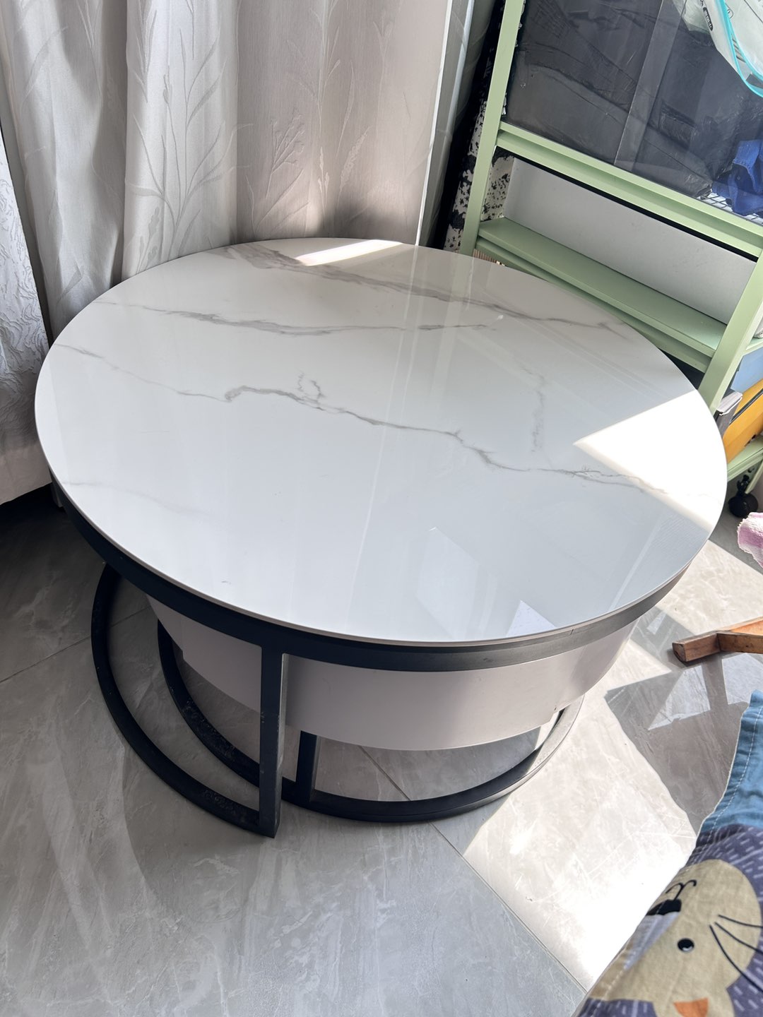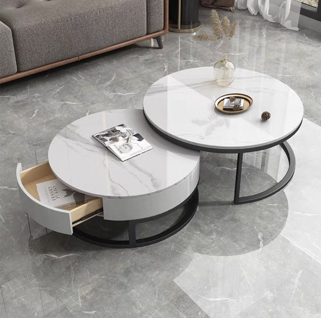 亮光岩板茶几轻奢现代家用简约小户型客厅圆形石桌网红侘寂风,可旋转可展开,带两个实木抽屉,基本没用便宜处理400元