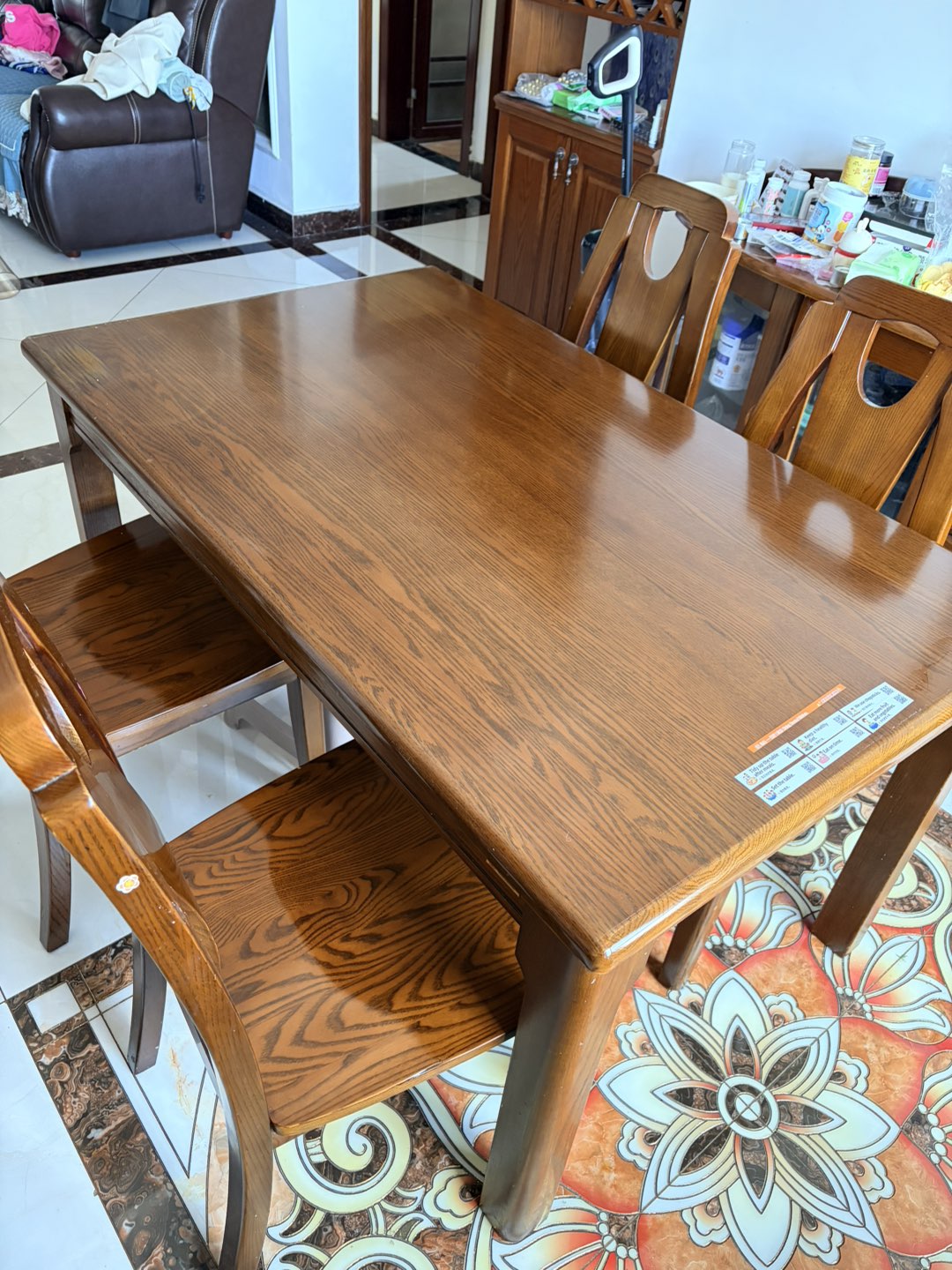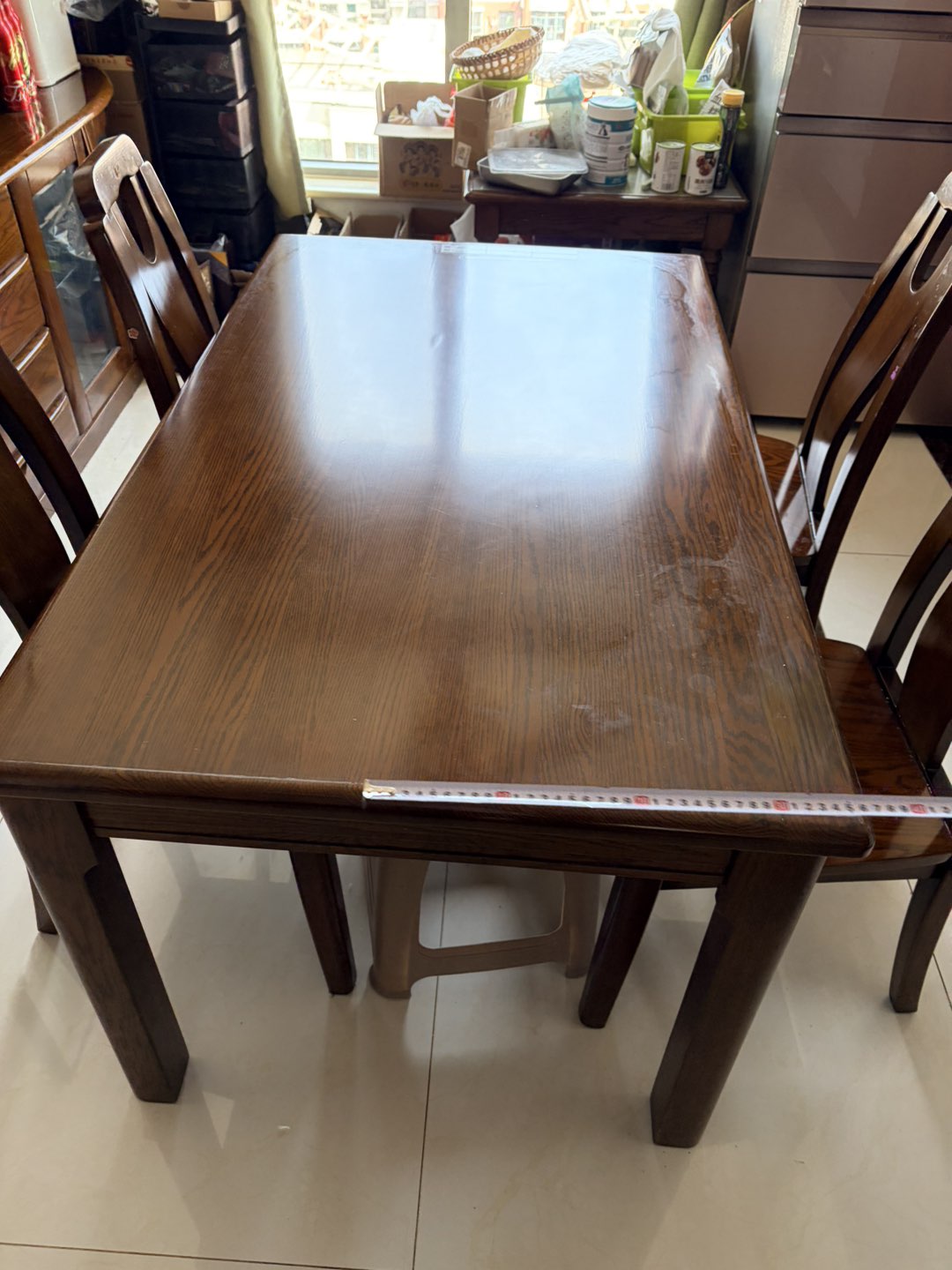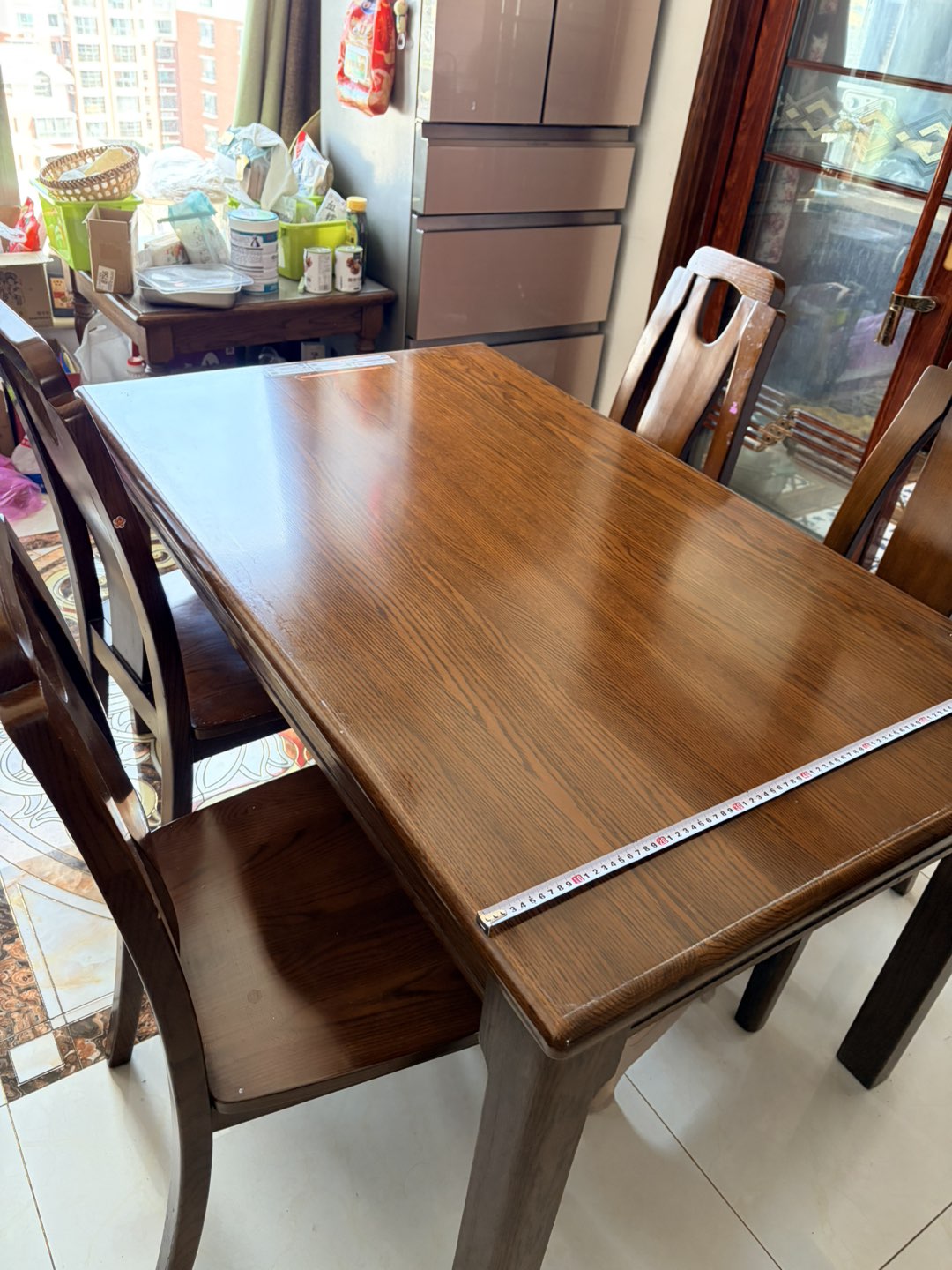 进口橡木实木餐桌带4把椅子,八成新,尺寸80*140,自提,6000多买的,卖3000(可议价)13573194803