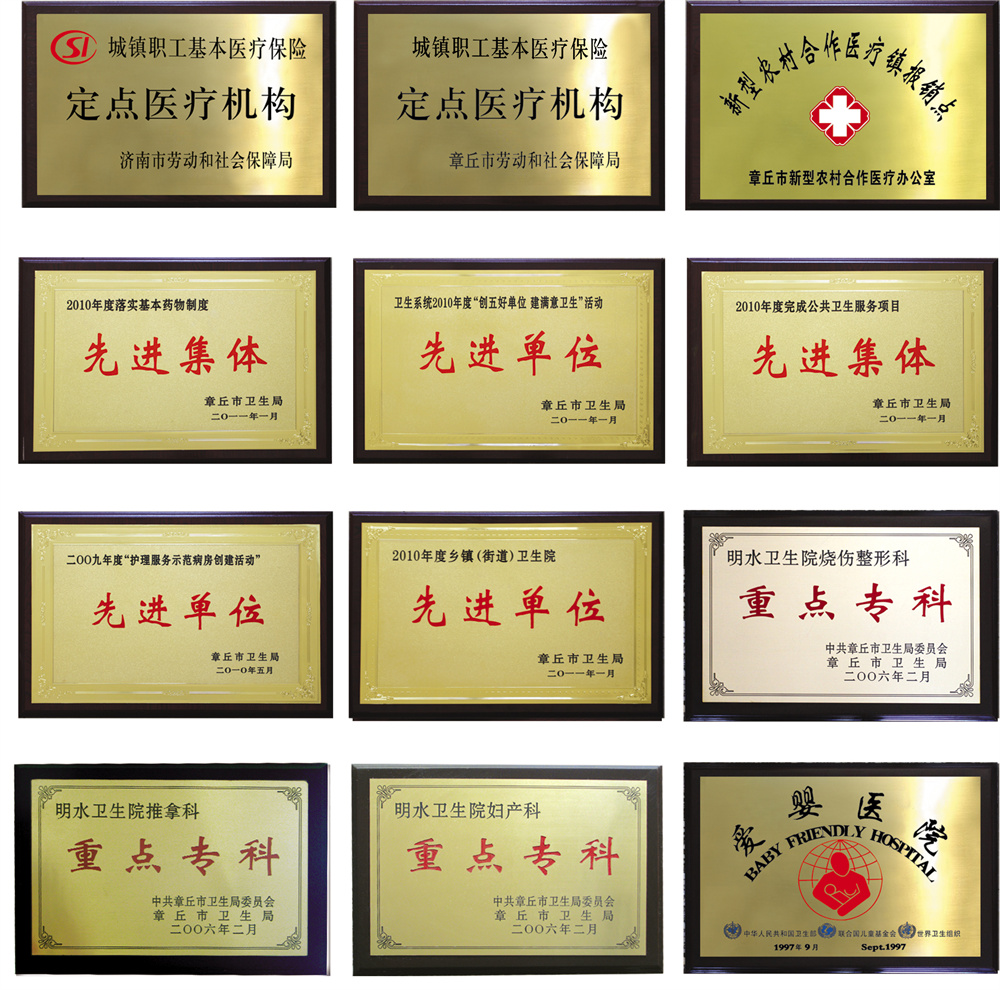 其中推拿科于2008年底被济南市卫生局批准成为济南颈、肩、腰腿痛病推拿医院,烧伤整形科于2010年底被济南市卫生局批准成为章丘市明水烧伤整形医院。