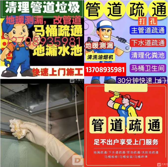 疏通下水道,测漏,打孔,防水,改装各种上下水管道,安装维修自来水,太阳能,落水管,漏斗,清洗油烟机,高压疏通下水道,清理化粪池。