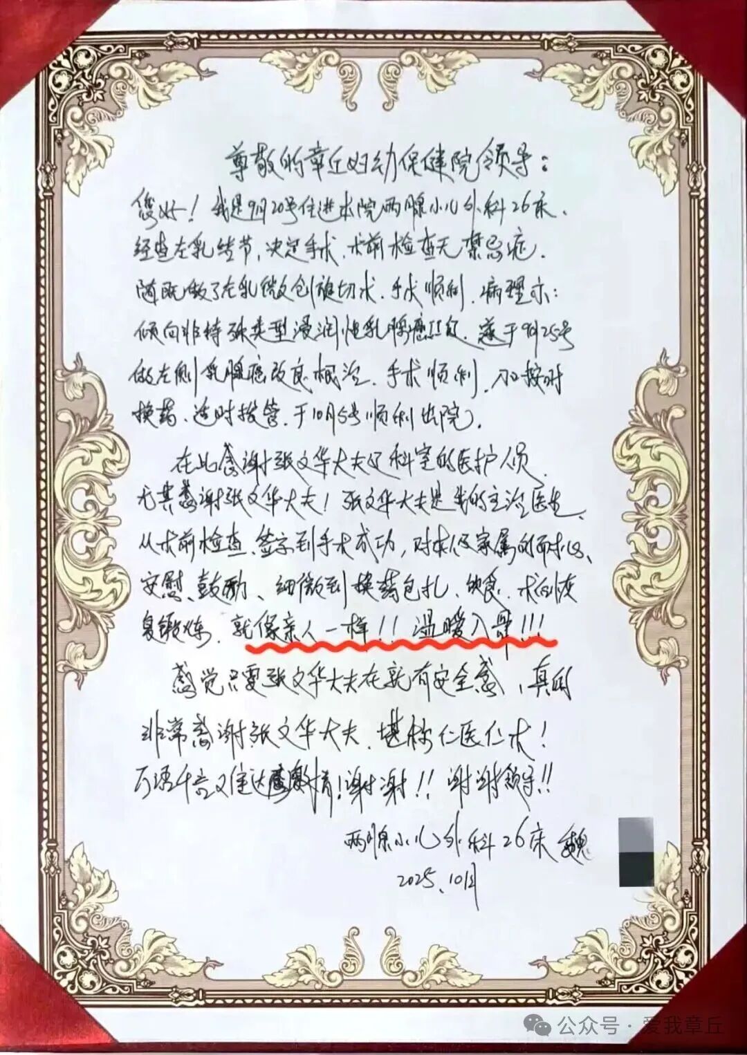 一封感谢信,是医患同心的见证,更是口碑传递的起点。乳腺癌并非绝症,可防可治的关键在于“早发现、早诊断、早治疗”。健康无小事,守护不缺席。章丘妇幼始终坚守“筛查前移一厘米,服务下沉零距离”的初心,把对每一位患者的关怀,融入筛查、诊疗、康复的每一个环节,为女性健康筑起坚实屏障。