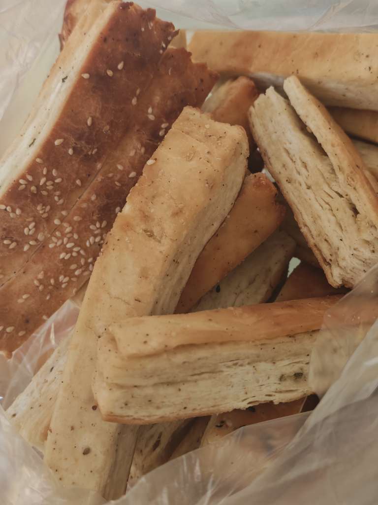 外面那层皮脆得掉渣,咬开是分层的软香,自带的咸口调味(还有甜口的,但没买过不知道啥味)裹满每一层,越嚼越香,一口下去又酥又韧,关键是顶饱还不贵!