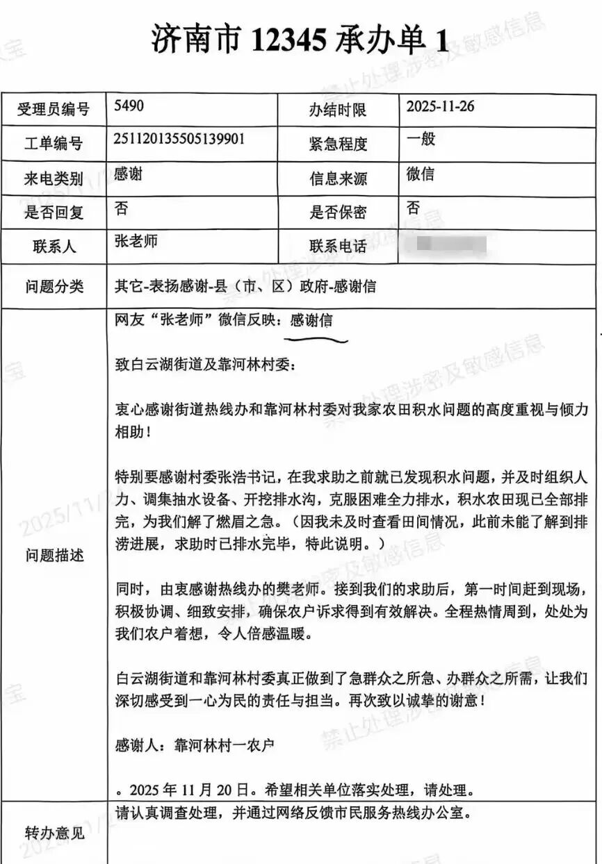 街道热线办是基层治理的“前沿哨所”和“神经中枢”。其根本性质是服务,核心职能是联动与督办,作为街道面向群众的首要窗口,是连接政府与村民的“连心桥”,承担着倾听民声、化解矛盾、排忧解难的关键角色。这封感谢信,正是白云湖街道热线办推动问题解决在基层、服务落实在一线的生动写照。