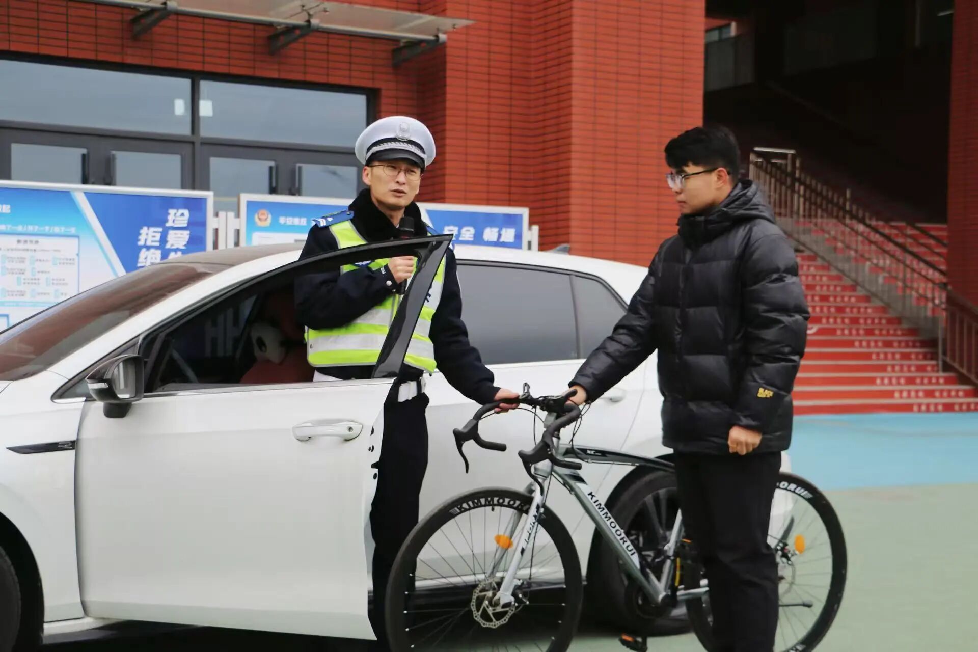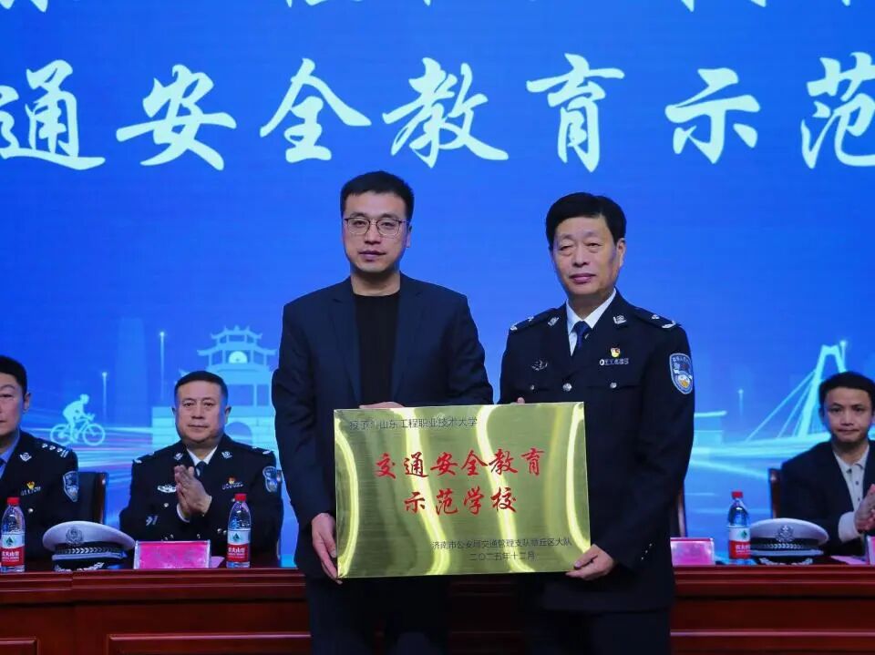 在庄重的“交通安全教育示范学校”授牌环节,张秉强大队长将牌匾授予学校,由安全保卫处处长徐永帅代表学校接牌。这一授牌,意味着学校交通安全教育工作获得了专业认可,标志着校警联动共建交通安全教育阵地的正式启动。