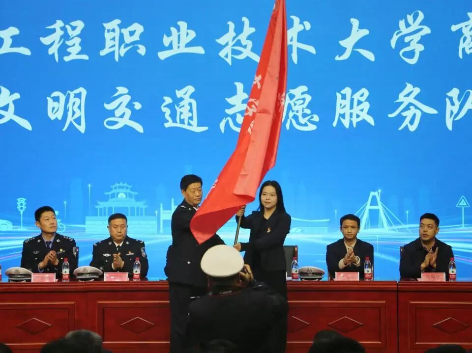 随后进行的“文明交通志愿服务队”授旗仪式,由交警大队领导向商学院授予队旗,团总支书记李琛作为代表接旗。这面旗帜,意味着学校首支专项交通安全宣传志愿服务队的正式成立,也象征着安全文明的理念将从校园主动向社会延伸。