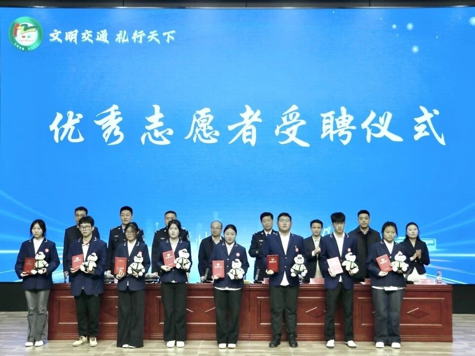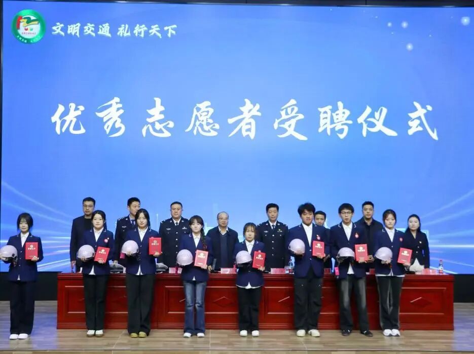 仪式上,为18名学生颁发了“交通安全宣传员”聘书,并赠送安全头盔与交通安全主题纪念品。