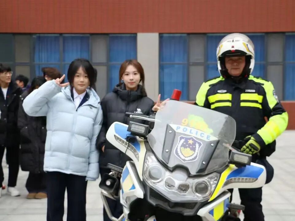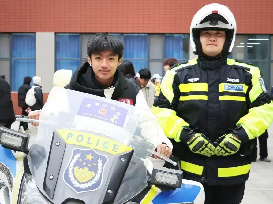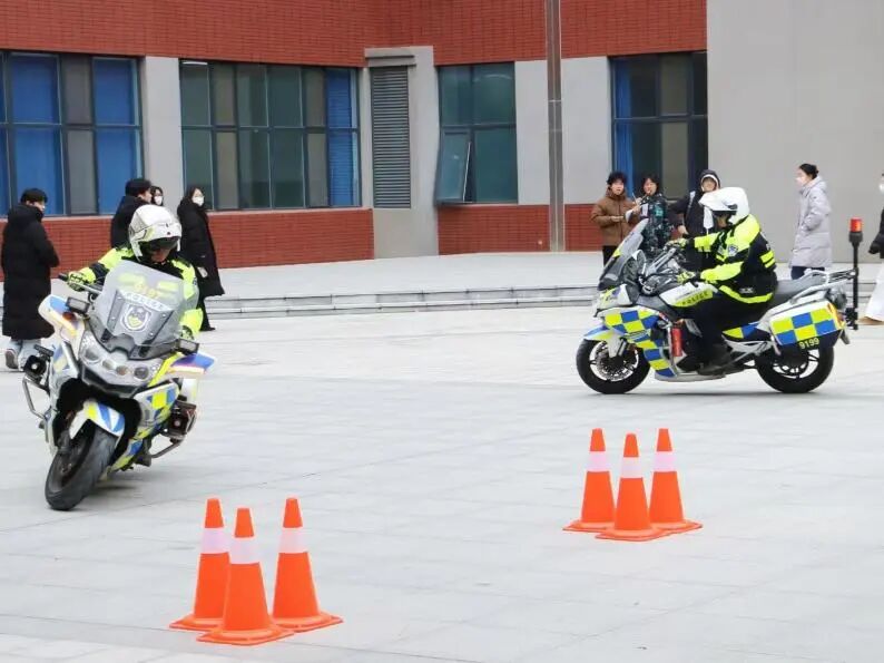 在摩托车障碍骑行演示环节,交警展示了安全骑行中的视线、速度与距离控制要点,同学们积极参与互动并与警用摩托车合影。