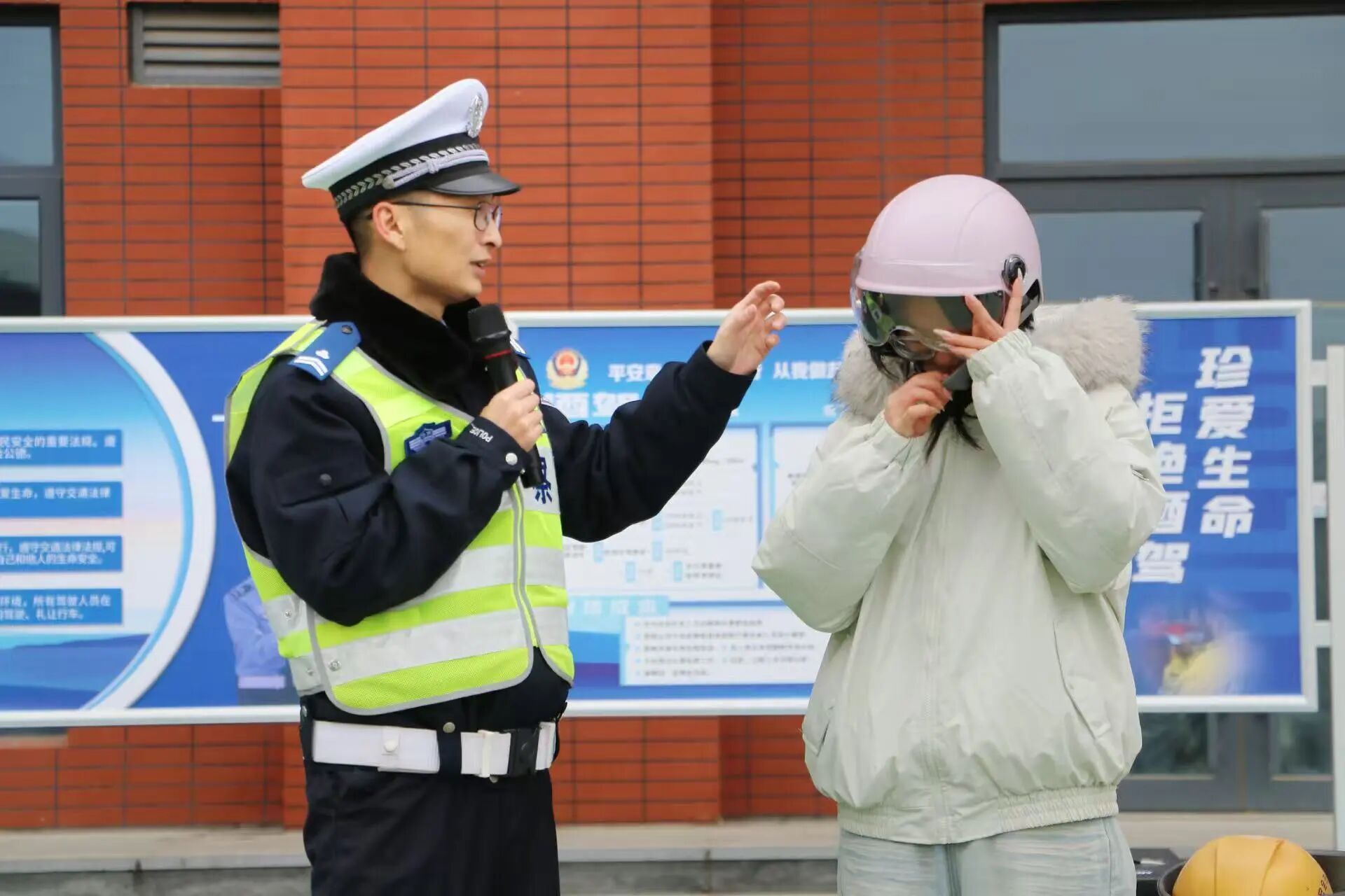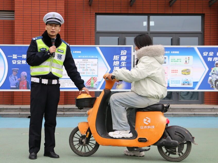 在沉浸式教学环节,交警现场讲解并示范了安全头盔的正确佩戴方法,解析车辆视野盲区风险,演示“荷式开门法”等安全技巧,让交通安全知识更加直观可感、易于掌握。