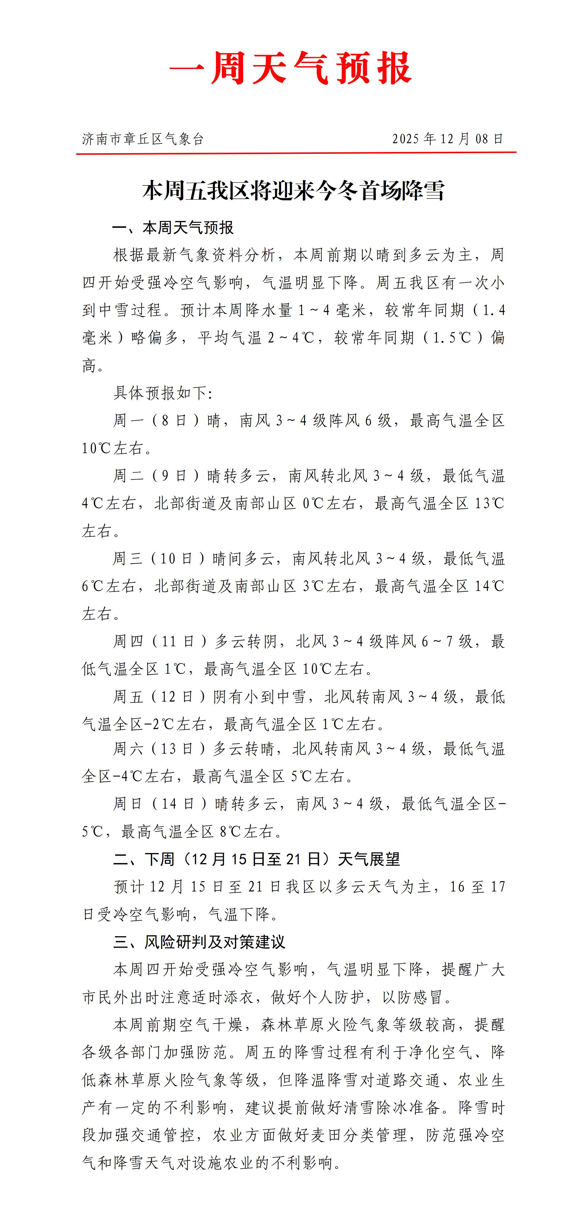 【章丘12月8日最新天气预报】章丘本周先暖后冷!周五首场小到中雪,准备好赏雪了吗
