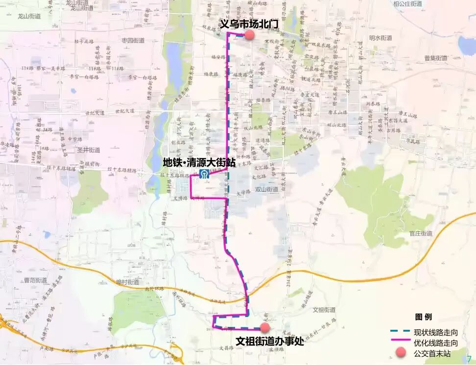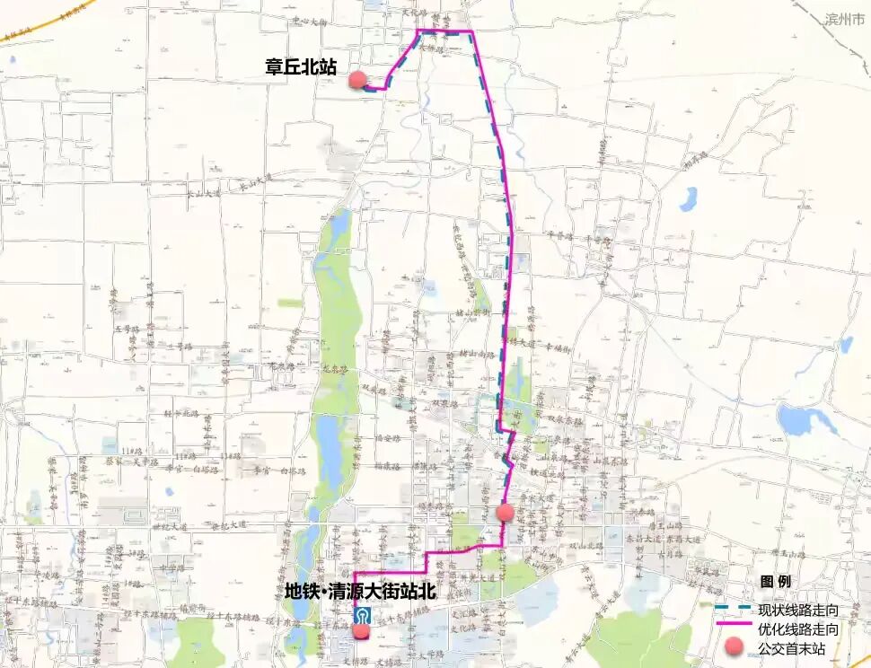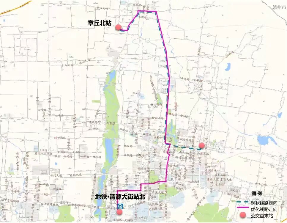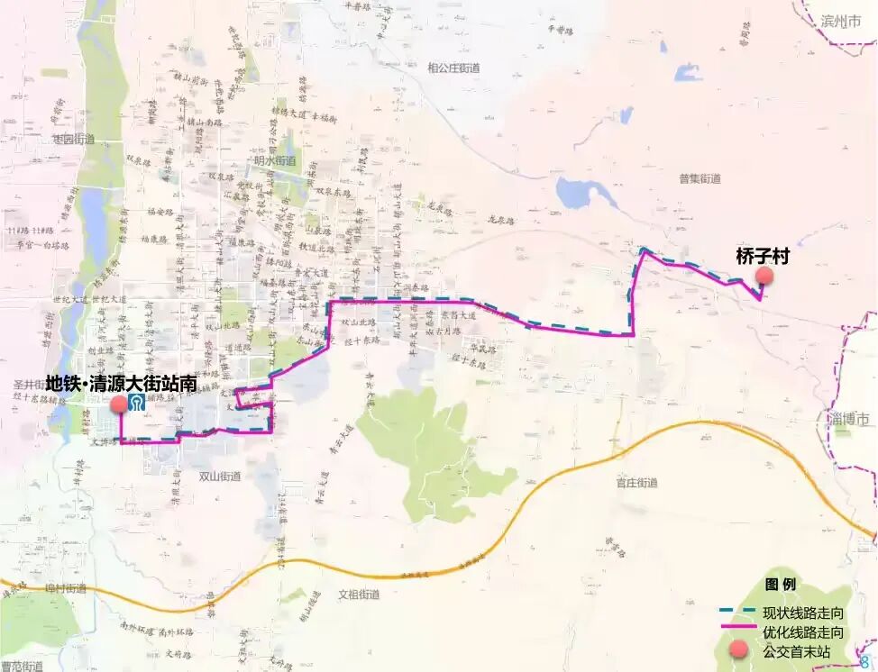 (1)优化内容:整体线路走向不变,优化站点设置,在清源大街与经十东路交叉口北侧增设“地铁·清源大街站北”公交站点。其他线路站点不作调整。