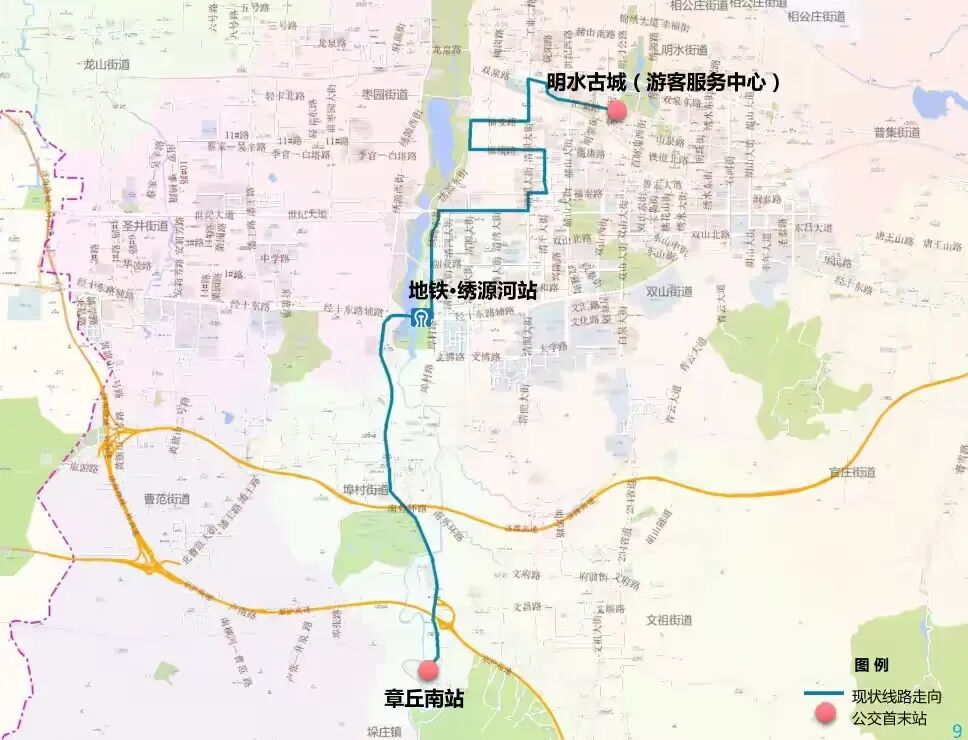 (2)途经站点:地铁·清源大街站北—鹅庄社区东—济钢机械—创业路清源大街—创业路清绣大街—公交公司—创业路清照大街—清平大街双山北路—山水泉城玺城—龙盘山公园南门—龙泉壹号南门—龙泉国际广场(上行停靠)—千禧龙大酒店—齐鲁涧桥—荣元广场—香港街南首—香港街—章丘宾馆—文化中心—明水古城(游客服务中心)—荷花广场(游客服务中心)—绣江河公园—湛汪村—吕家村路口—浅井村—西营村—前营村—百脉示范园—相公庄路口—宫王村—樊家村—八里辛庄—东皋村—三星村—绣惠供电所—绣惠原钢铁市场—太平村—东关大桥—杆桥路口—东南隅—宇龙公司—章丘北站