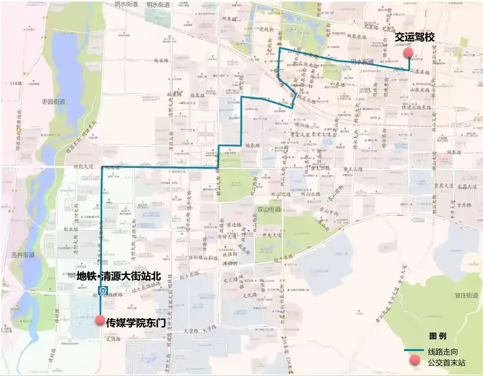 (2)途经站点:传媒学院东门—地铁·清源大街站北—鹅庄社区东—济钢机械—徘徊村路口—太平村—刘台村—凤鸣山社区—丰汇集团—诺德名城—玉龙山社区—东风工业园—疾控中心—章丘体育公园—福泰小学—实验中学—圣代商场—矿业培训中心—香港街南首—水务局—工商银行—文化中心—百脉泉广场—桃花山公园—明水街道办—明珠北区—明一花园小区—交运驾校
