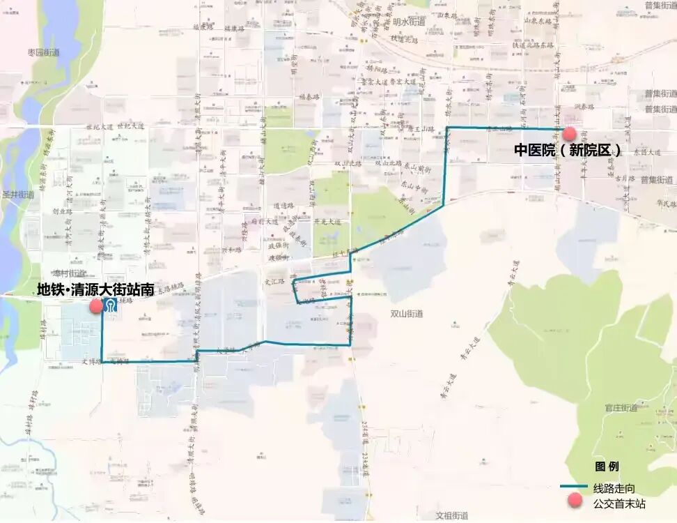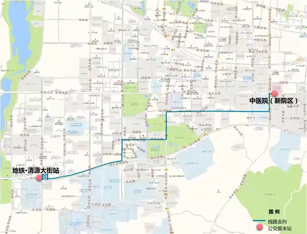 (1)线路走向:由地铁·清源大街站发车,经经十东路、赭山大街、开先大道、双山大街、双山北路、胡山大街运行至中医院新院区;串联章丘四中片区、东山片区、政务区对接轨道交通8号线。