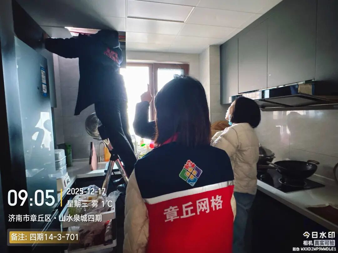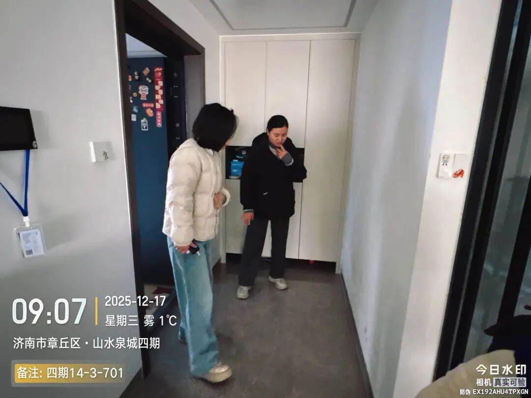 群众的诉求就是行动的指令。社区工作人员在接到居民的求助后,丝毫不敢怠慢,第一时间与居民取得联系,12月17日一早,社区工作人员、物业工程经理与爱护家维修师傅便准时来到701室居民家中。上门实地查看墙面洇水情况,耐心倾听居民的困扰与诉求。刚走进家门,大家就看到墙面洇水的痕迹十分明显。维修师傅蹲下身,仔细观察墙面渗水的位置和走向,结合多年的维修经验,初步判断漏水点可能与楼上801室的管道有关。毕竟上下楼管道相连,上层管道若出现渗漏,很容易影响到下层住户。