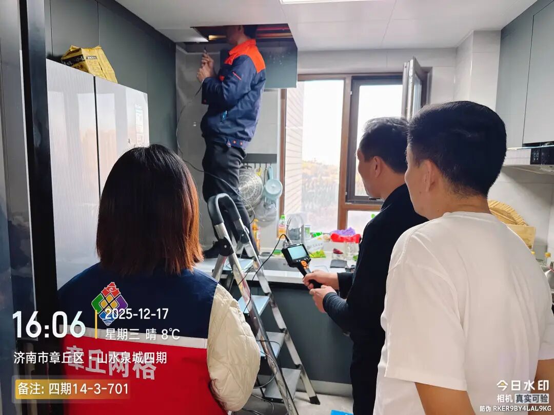 但是我们不愿意放弃,重新收拾心情,准备换一个思路,“既然楼上管道没问题,那咱们就把目光放回701室,漏水点说不定就藏在吊顶里面!”维修师傅的一句话,让大家重新燃起了希望。说干就干,维修师傅小心翼翼地拆除厨房顶部的扣板,然而,内部空间狭小,肉眼只能看到裸露在外侧的管道情况,无法看清全貌,只能把手伸进去一点一点的仔细摸索检查。“找到了!就是这里!”随着维修师傅一声兴奋的呼喊,所有人的目光都聚集过来,“我在管道后边摸到一条类似裂纹的痕迹,不出意外,漏水的根源就是这里。”为了查看裂纹的具体情况,维修师傅拿出了“秘密武器”——内窥镜。他将纤细的探头缓缓伸入管道后方,一边移动探头,一边紧盯着屏幕。屏幕上清晰地传输着管道内部的画面,大家都屏住呼吸,生怕错过任何一个细节。“看到了!”只见画面中,一根公共管道的管壁上有一道长长的裂缝,正有细小的水珠从中渗出,这正是导致墙面反复洇水的“罪魁祸首”!