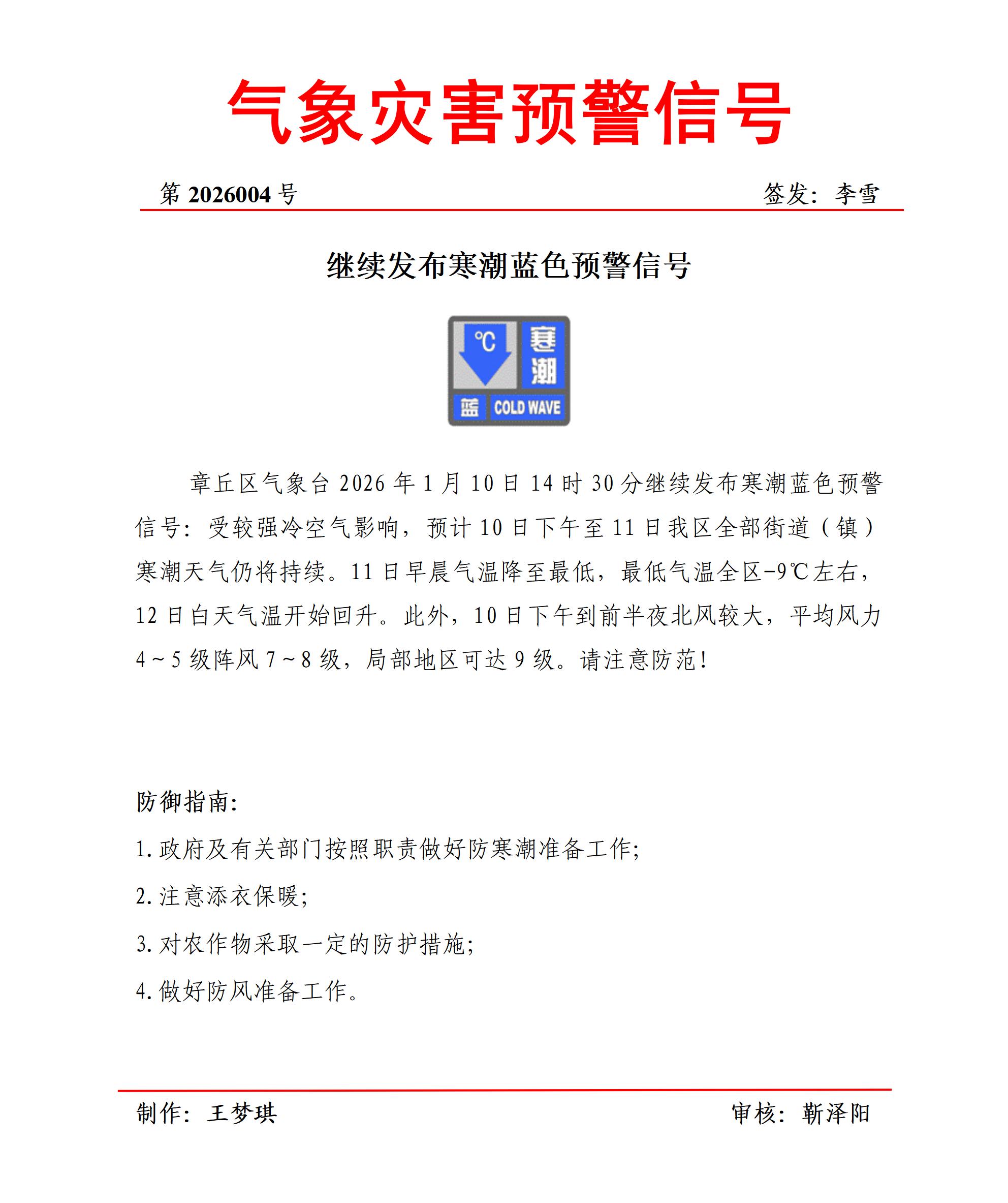章丘区气象台2026年1月10日14时30分继续发布寒潮蓝色预警信号:受较强冷空气影响,预计10日下午至11日我区全部街道(镇)寒潮天气仍将持续。11日早晨气温降至最低,最低气温全区-9℃左右12日白天气温开始回升。此外,10日下午到前半夜北风较大,平均风力4~5级阵风7~8级,局部地区可达9级。请注意防范!