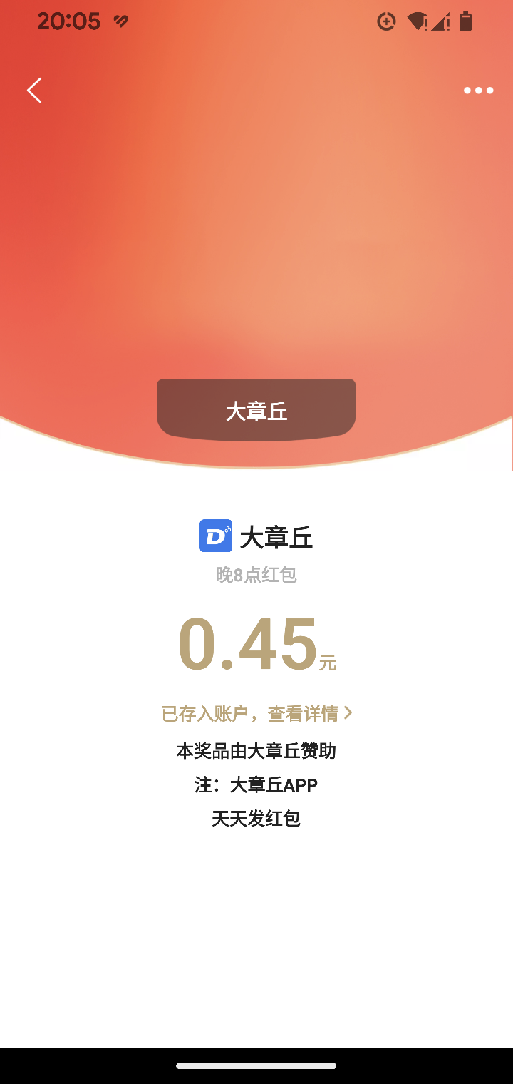 今晚八点红包,手气真好。0.45元。感谢大章丘。祝愿大章丘越来越好。