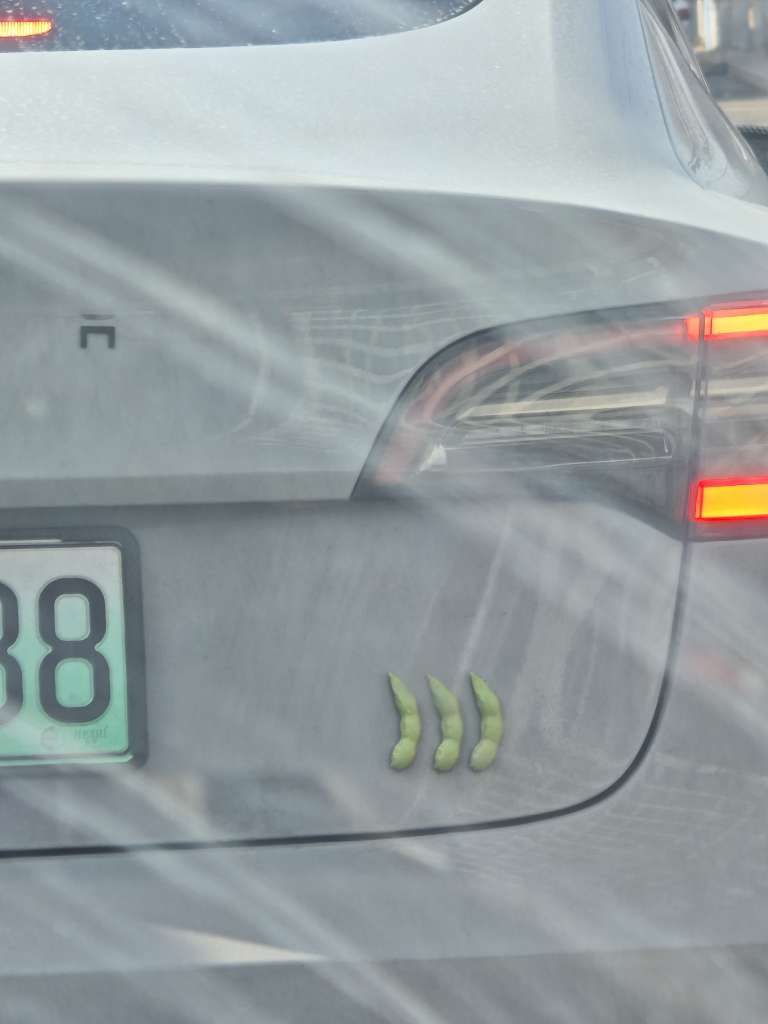 今天在路上看到一个车,贴了仨毛豆,看了半天寻思了半天啥意思,一看特斯拉恍然大明白,各位章友知道是啥意思嘛