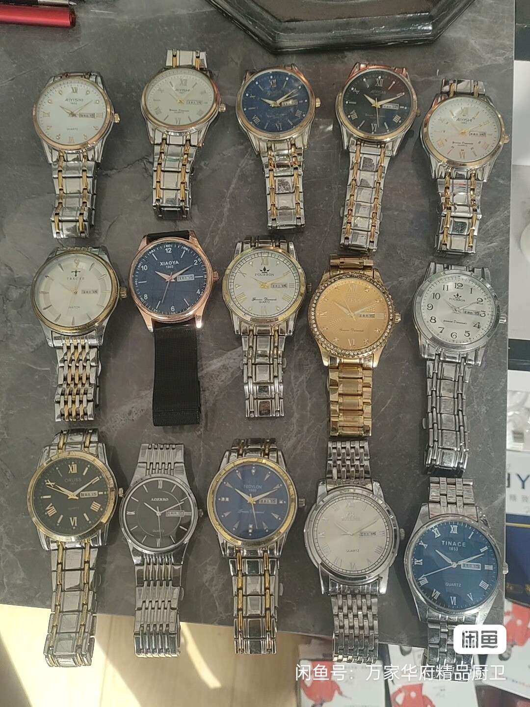 出库存石英表15块,双历显示,表径39---45mm,钢带+间金款,石英机芯,走时正常,功能都好用。部分外观有轻微划痕,玻璃都完好,按配件处理,具体看图。喜欢哪块圈图,细节私聊。20元一块