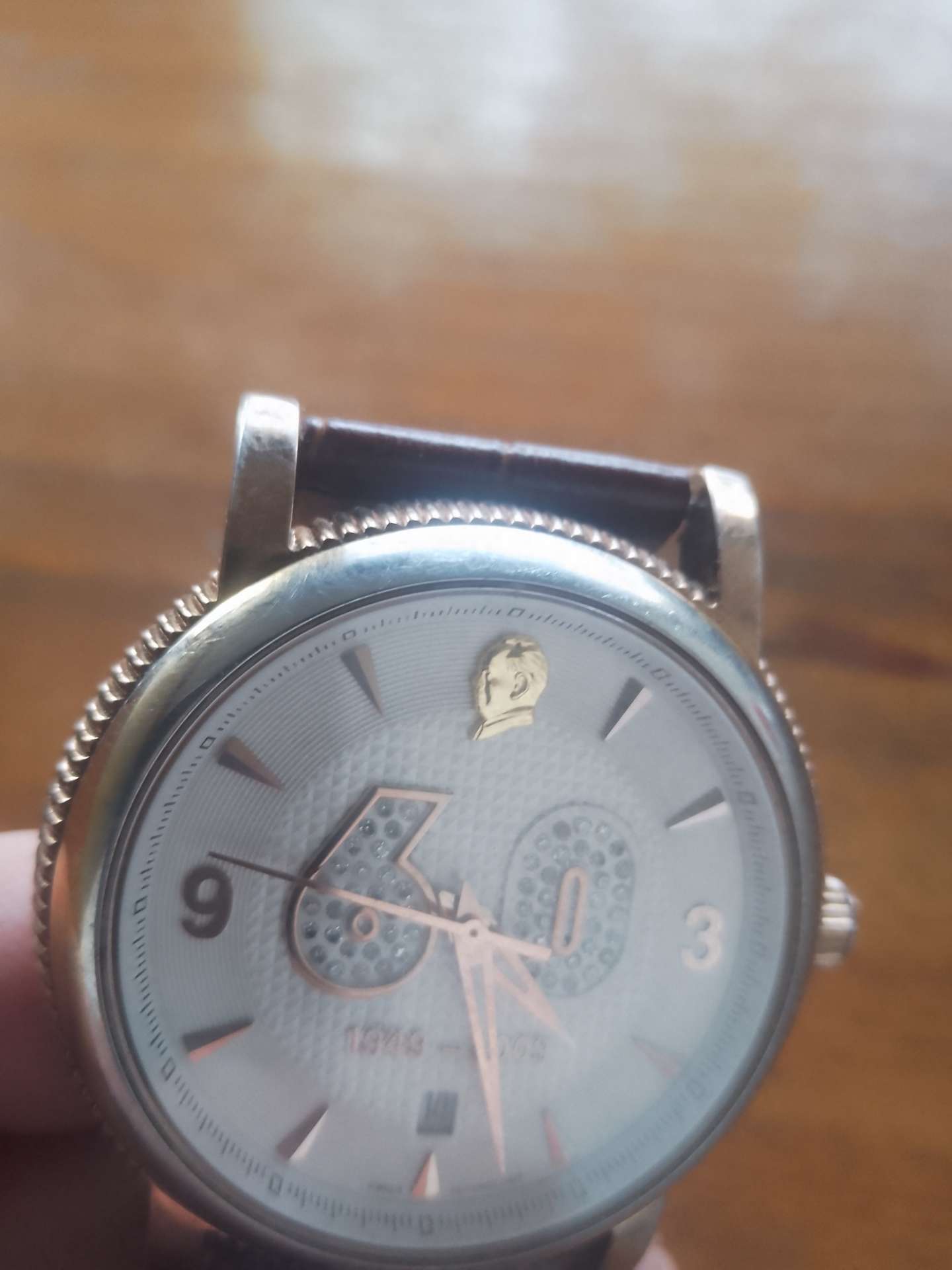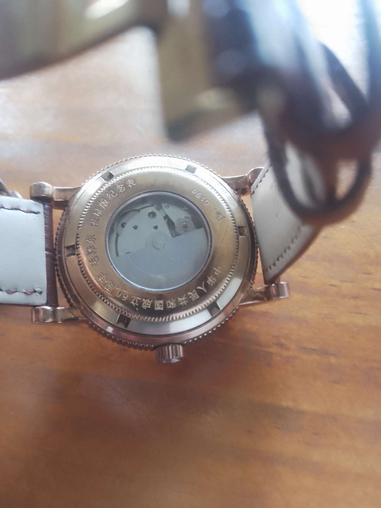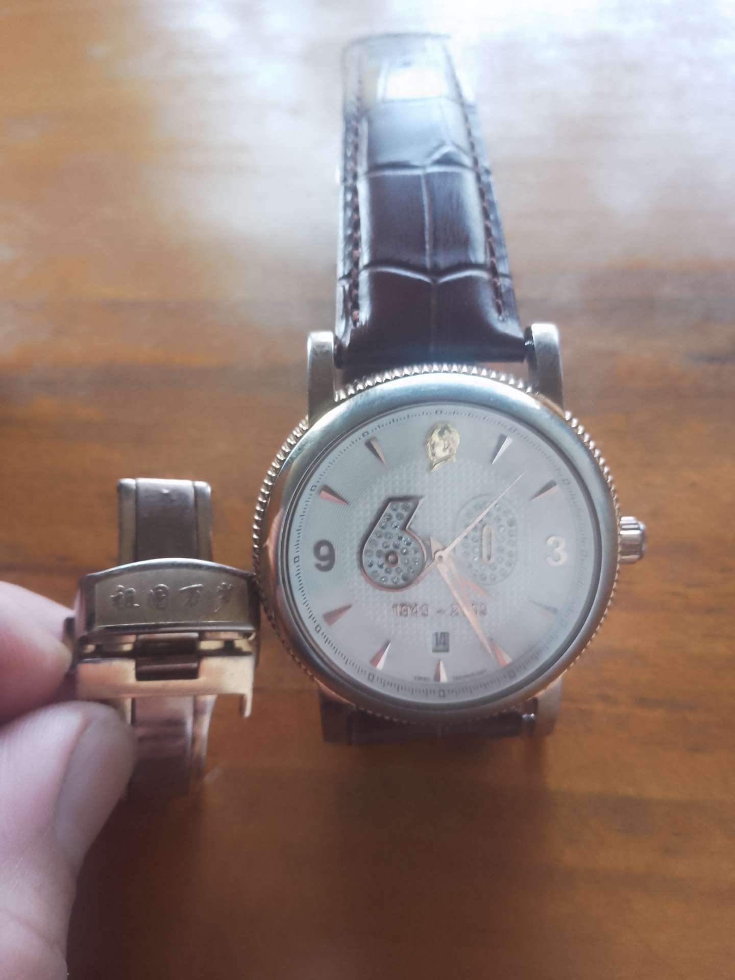 祖国万岁60周年金钻机械表,走时正常,12点位置纯金毛主席头像,那个O圈掉下已取出。表带换了,原表扣还在。有很高的收藏价值。有喜欢的联系。价格800元出,