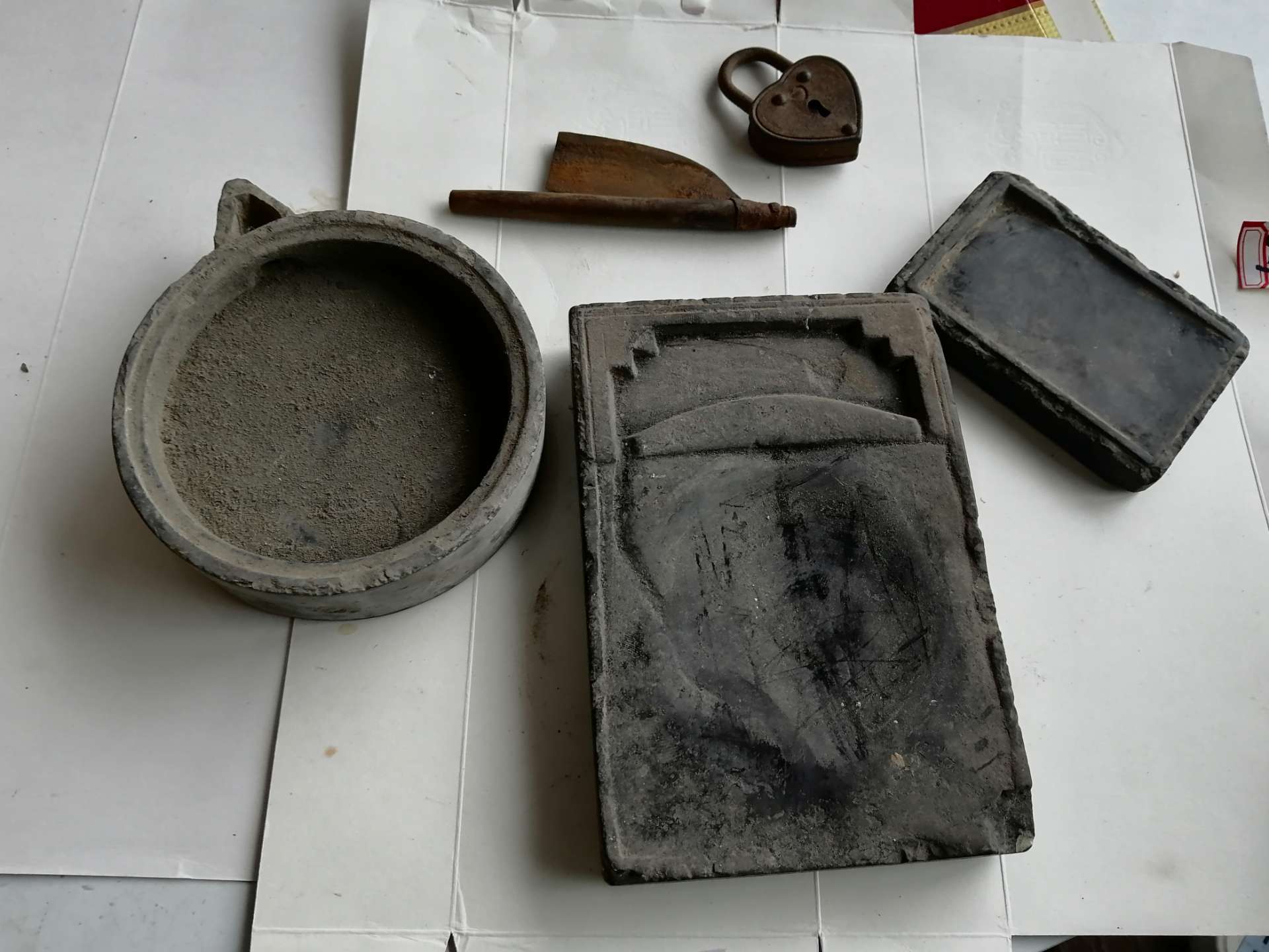 一线淘货低价出售,福寿大刻盘直径四十左右,单个一百二,俩个一起200元,一九五四年世界知识手册168元,罕见的砚板120元,民国带堂号小碗50元,组合图里,民国心形锁没钥匙当个挂件10元,清代民剃须刀30元,清代圆砚品相好68元,清代方砚有磕碰40元,都是自提价,非诚勿扰不喜勿喷,谢谢支持