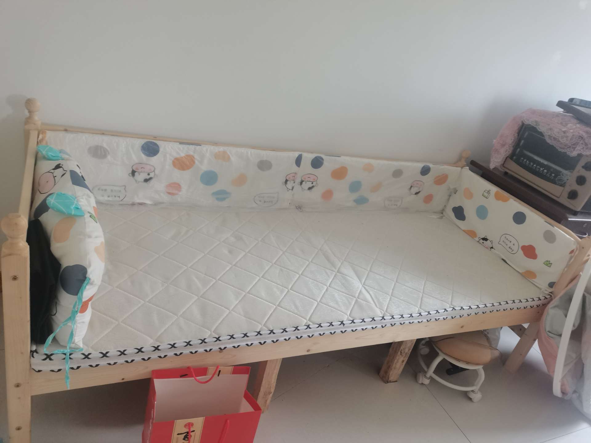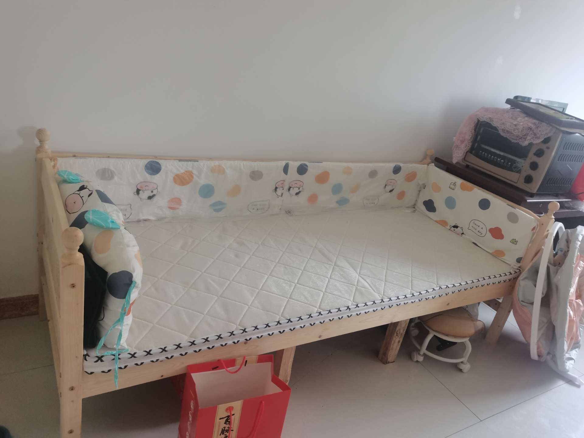 个人的婴儿拼接床,70x2米,高度43cm(不加床围),全新买的没用过,尺寸合适,环保木头没有味道,适合宝宝用。全套都在,床垫和床围一起送。家里空间不够闲置出来,有需要的可以聊聊,价格可小刀。