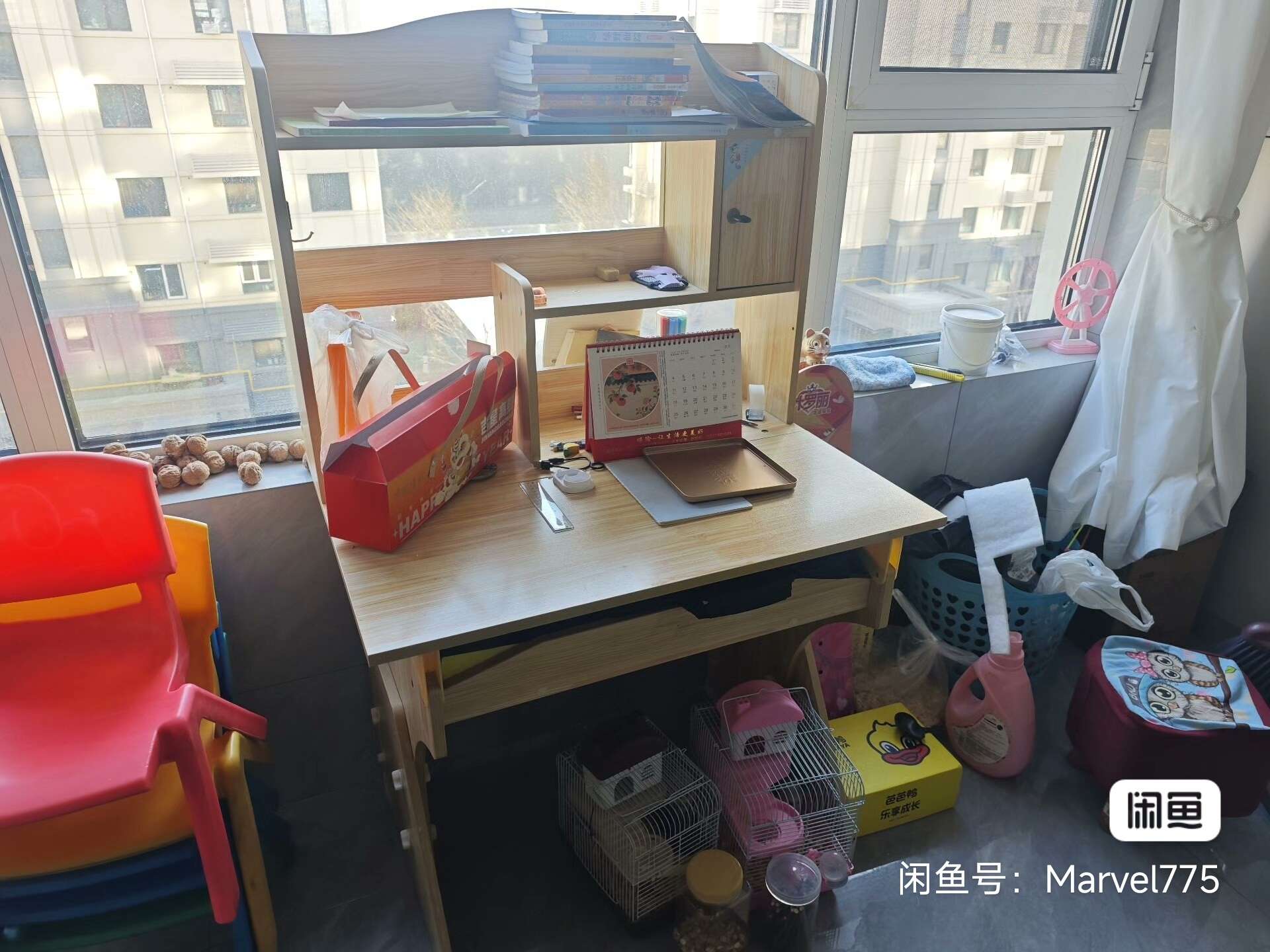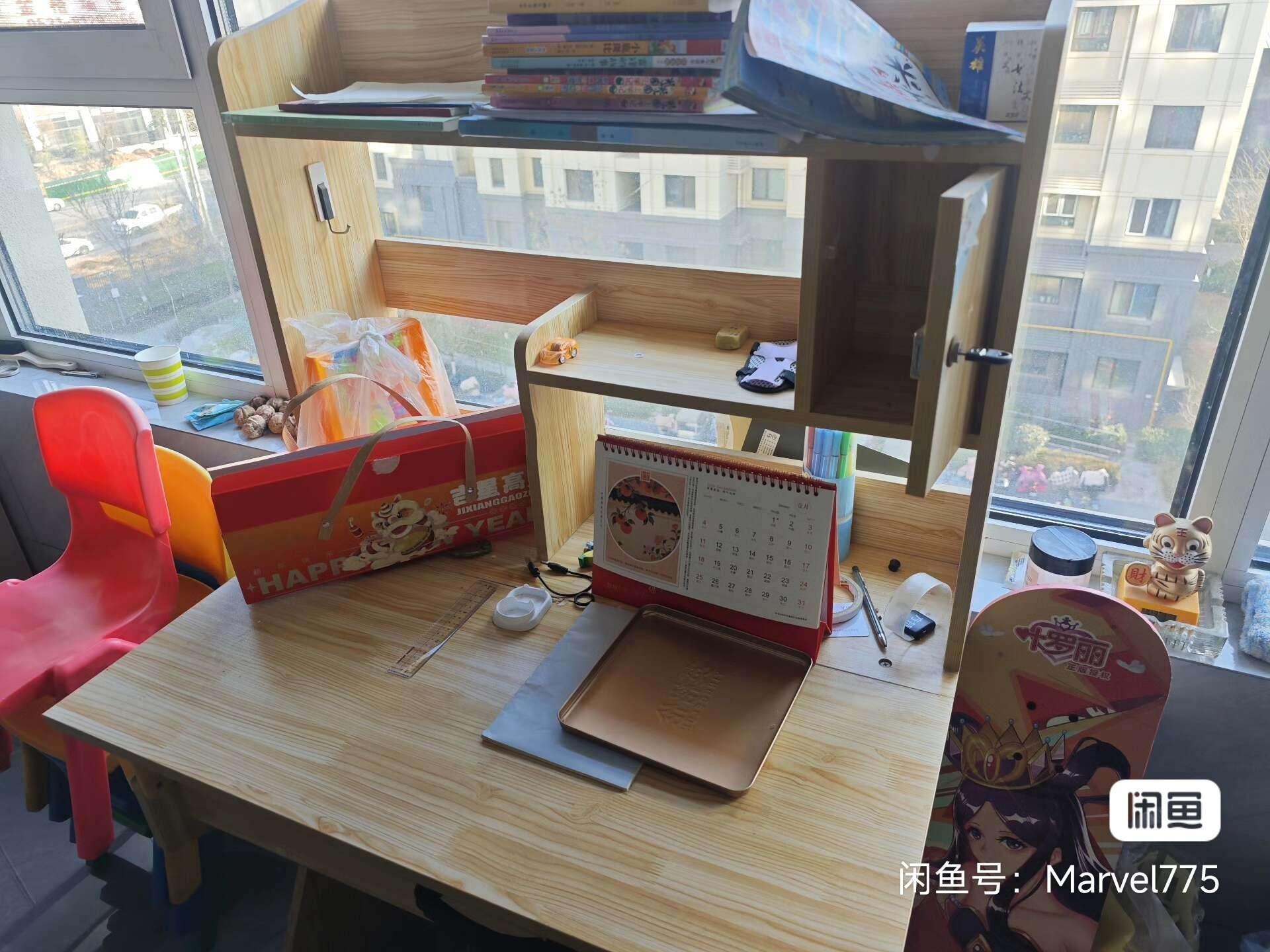 出儿童学习桌,木质,带书架和收纳柜,桌面宽敞,桌腿结实,高度可调,适合小学生用。桌子质量不错,收纳空间大,放书本文具很方便,带一个类似图上这种的椅子