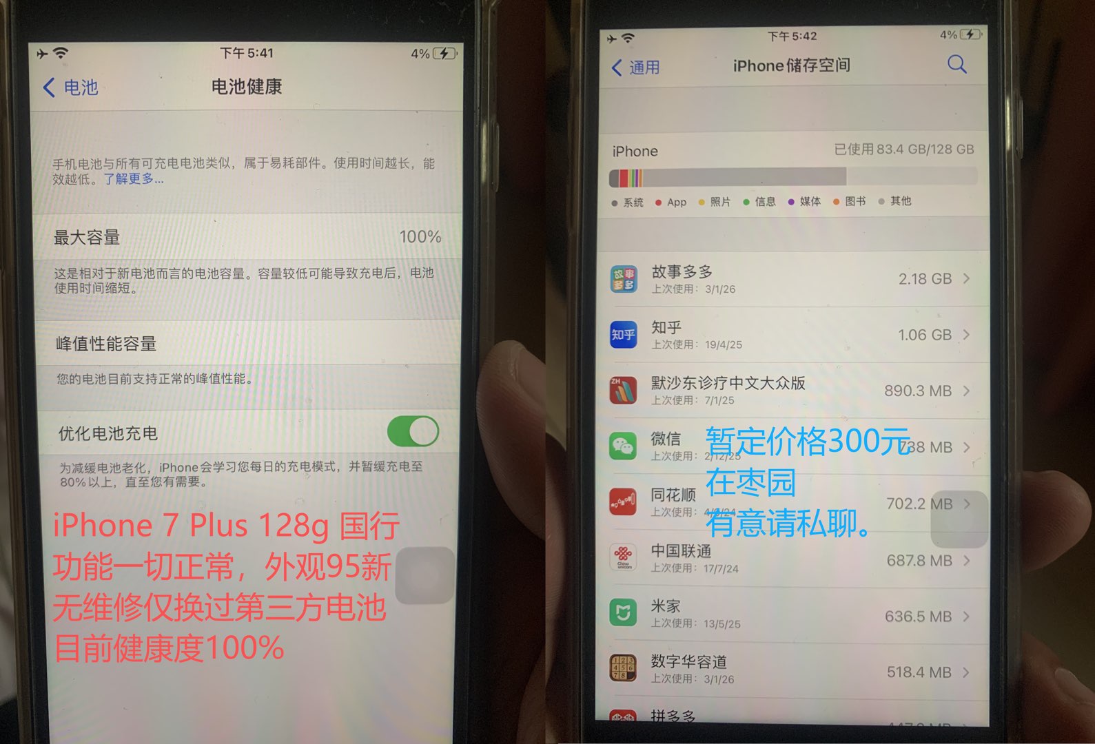 iPhone 7 Plus 128G国行功能全部正常,外观非常新无磕碰电池后来换的现在的健康度是百分百 苹果手机7 价格暂定300,好商量 微信或电话联系都可以
