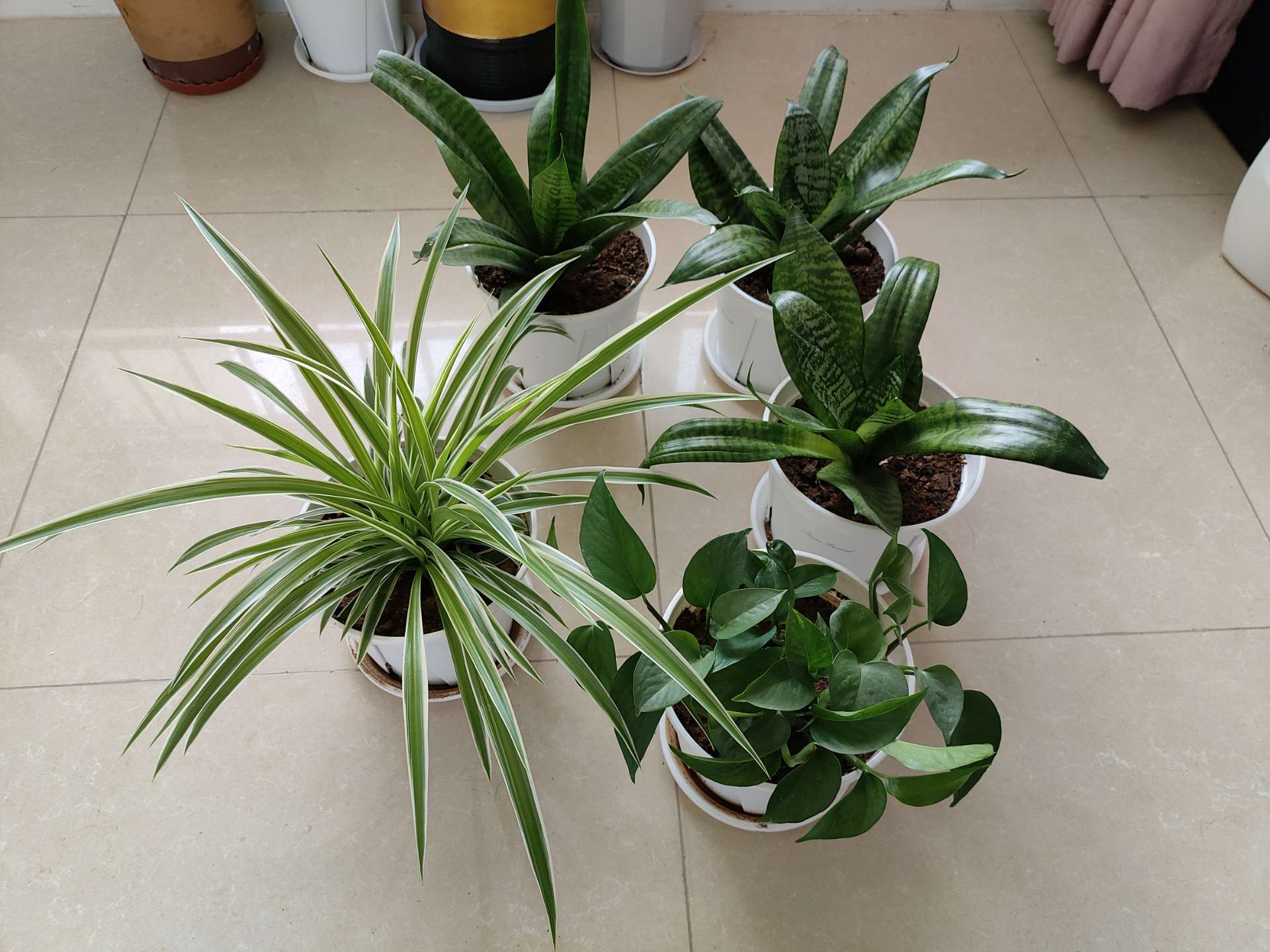 1、紫背万年青+绿萝+金边吊兰+紫叶吊兰