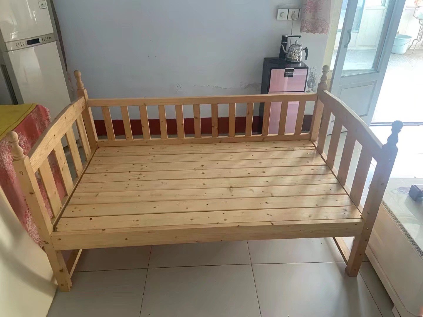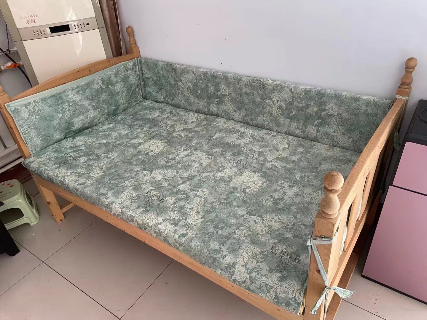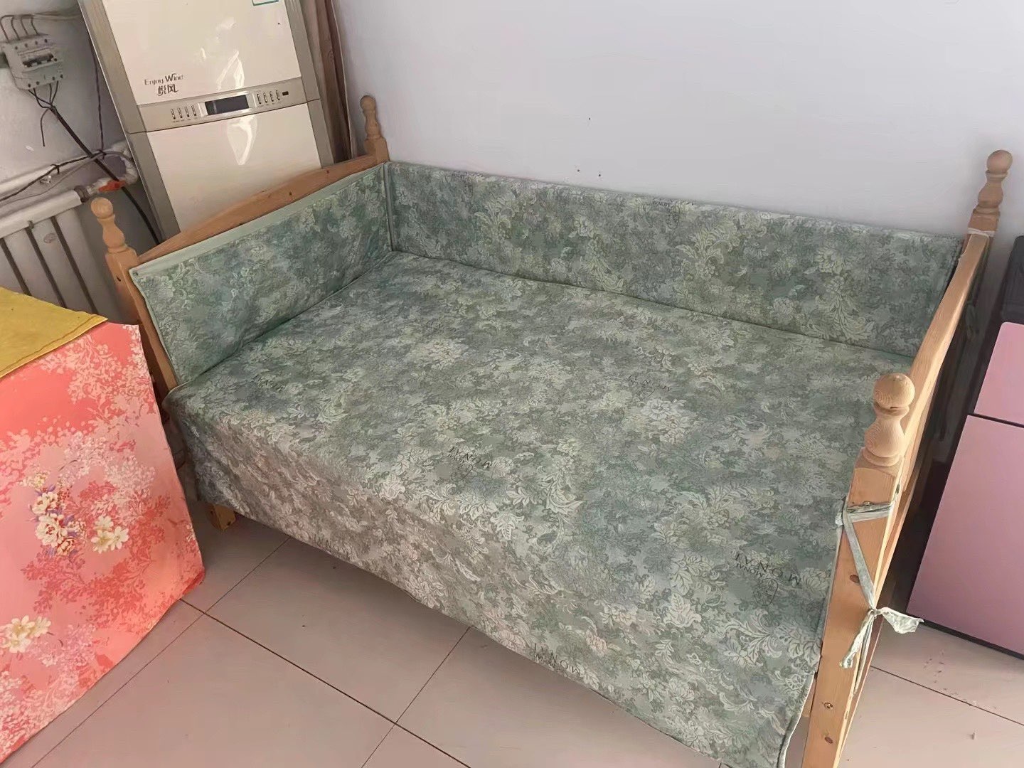 实木儿童床,婴儿床,长1.6米,宽90厘米,高45厘米,买了没怎么用,顾家家居购买当时加床垫1500元,床垫两层10厘米,现在床➕床垫➕床围布600元带走