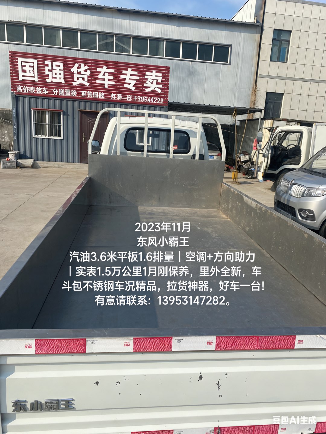 2023年11月份上牌的东风小霸王汽油3.6米平板,L1.6,空调有,方向助力有,1.5万公里实表,原版原漆好车一辆。车斗全包不锈钢板,钢钢滴,好车碰有缘人,错过无