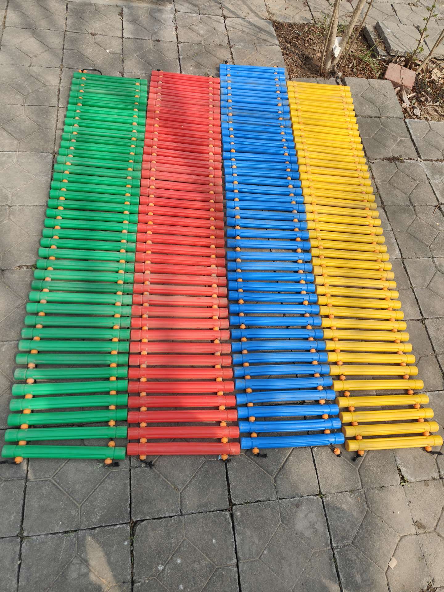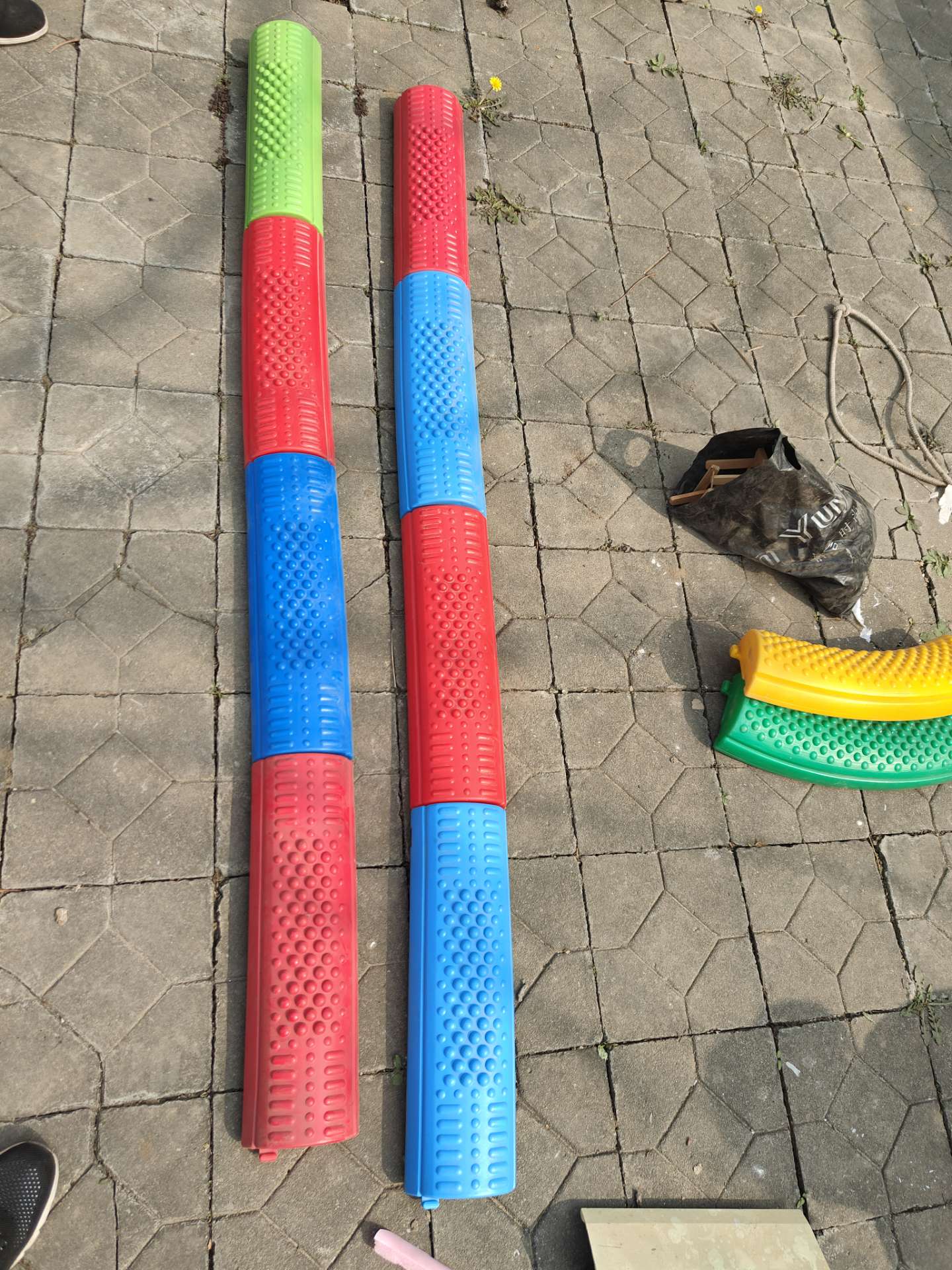 绿小鸭双人跷跷板1个,圆柱阶梯两个,单人摇摇马3个,几何阶梯1个。平板四轮车一个,小椅子20把,大陀螺,一个大滚桶,一个蹦蹦床。一张绘本架,一个平衡木,一桥两端一个,滑梯一个,蓝红正圆一个。万象组合独木桥一个,毛巾架一个,竖抱筒桶1个,茶杯柜一个,电烤箱1个,八直八曲平衡桥1个,平衡步道1个