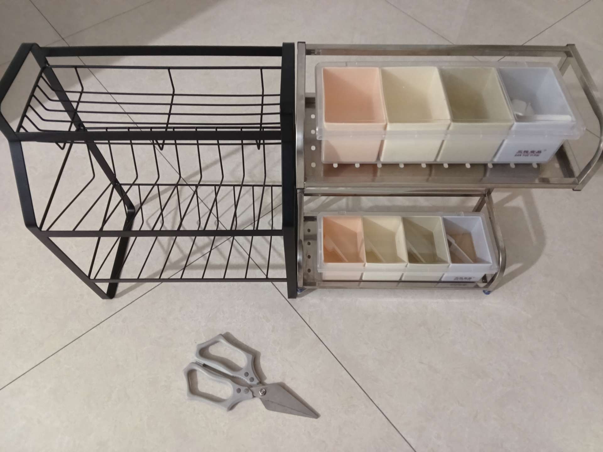 两个厨房置物架全新的没用过,剪刀和两个调料盒很厚实用过几次,50打包处理