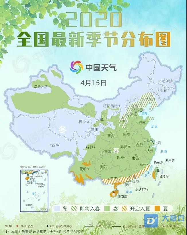 从季节分布图来看,通常谷雨期间春的范围达到鼎盛,超500万平方公里。
