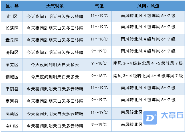 济南市气象台4月19日16时发布的区、县天气预报: