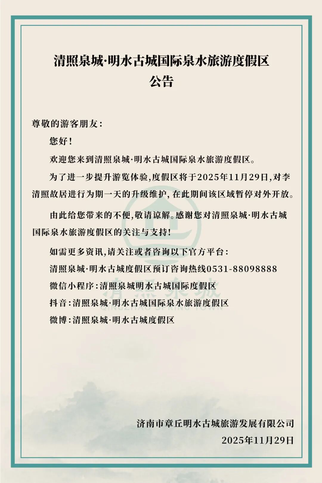 11月29日,清照泉城·明水古城公众号发布公告: