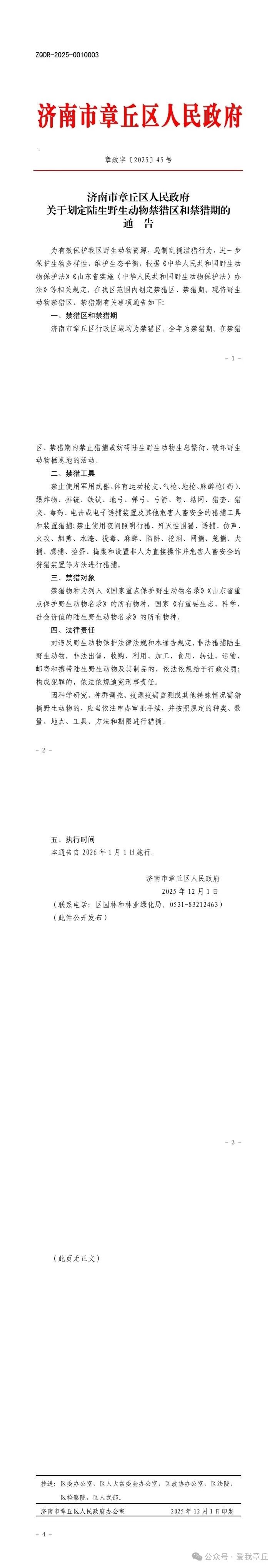章丘2026.1.1起全域全年禁猎