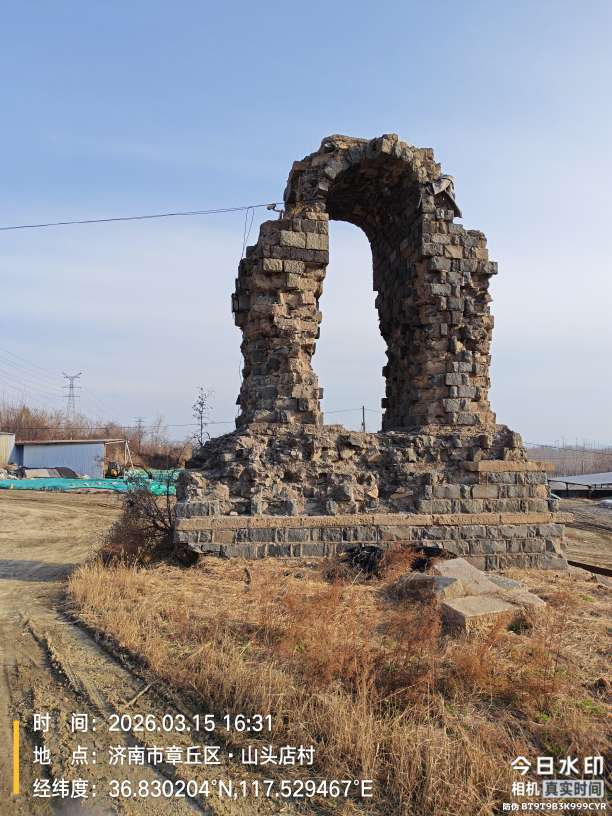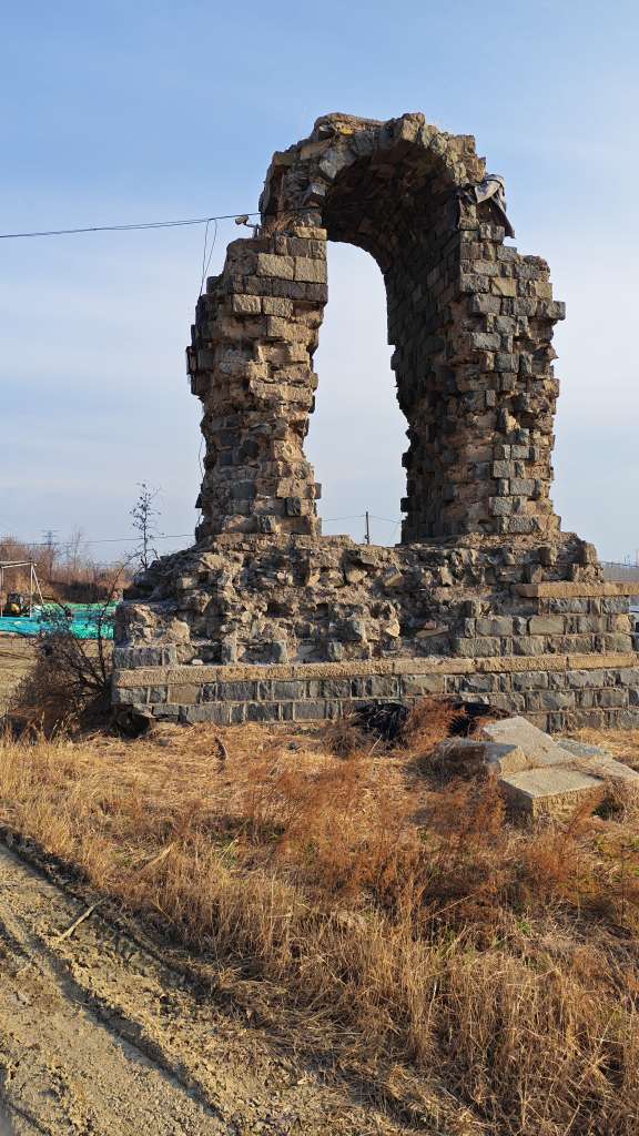 我到了以后看到一个绣惠的大姐在挖了一大袋子,我问她挖的啥?她说是白蒿,因为我没见过这种野菜,所以不认识!咱也没挖!于是在山上转悠了一会!转悠时还看见了一处破损古楼的石质拱门残迹,沧桑的青灰石块垒起残缺轮廓,在晴日旷野里很特别。问了当地居民,只模糊听说这是以前的水楼,如今建筑已被拆除,只剩这半截拱门静静伫立。