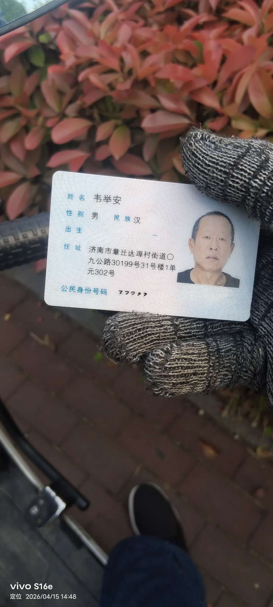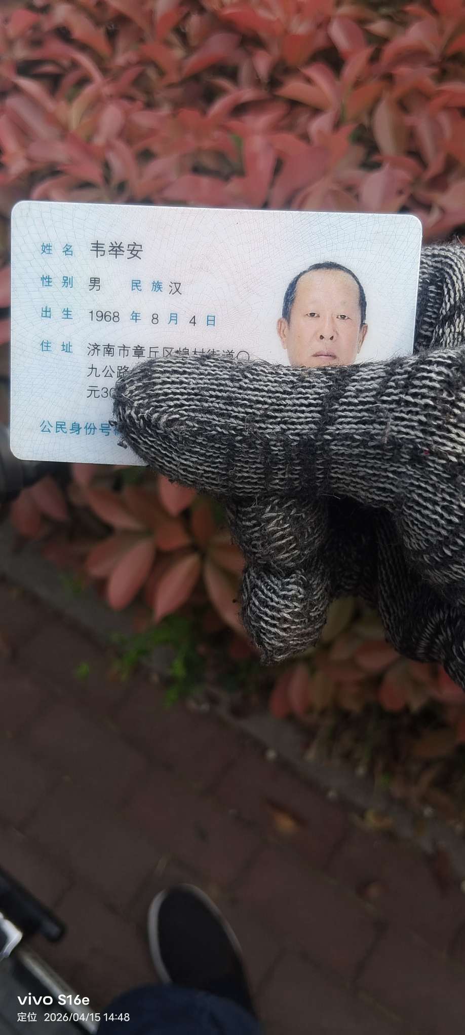 本人今天下午2点半左右在和谐广场北侧十字路口东北角捡到一张身份证,放在妇幼保健院门诊楼那个大门口警卫室里面了!希望失主或者家人朋友看到后告知本人去领取
